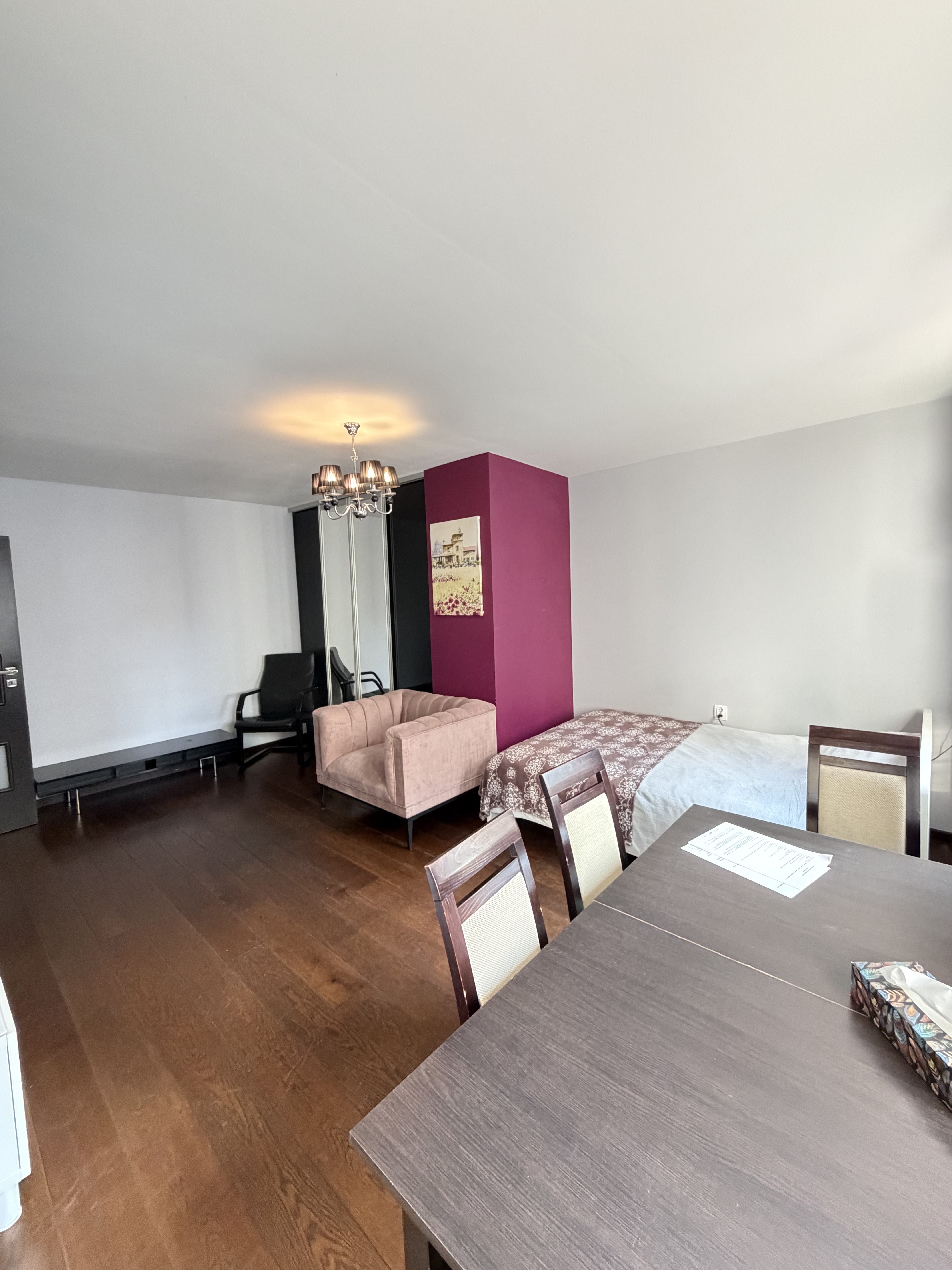 Room 1 – small sofa – for sitting, double bed , table with chairs , big wardrobe, TV.