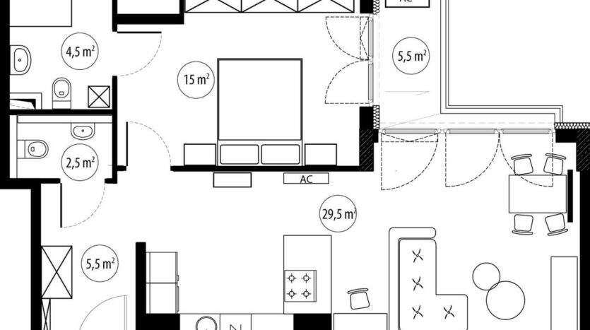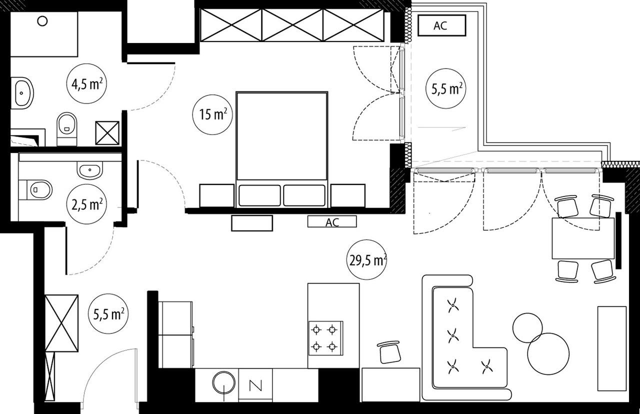 Spacious 2 rooms apartment 57m2, living room with open kitchen, bedroom, bathroom, separated toilet, balcony.