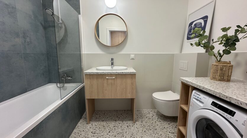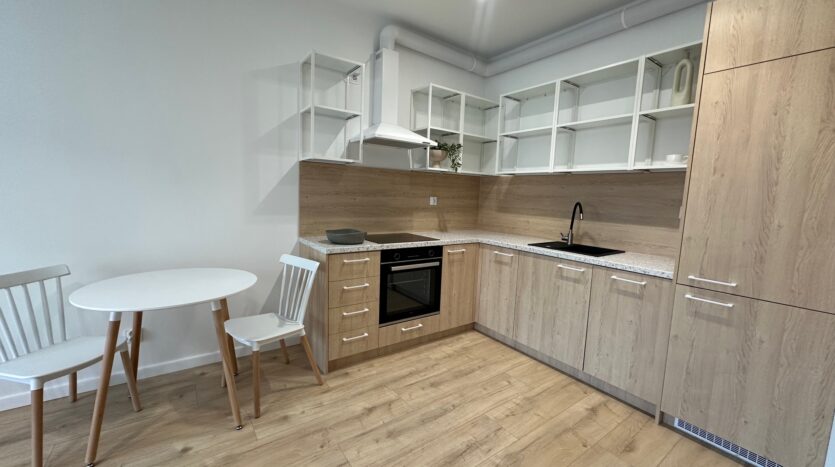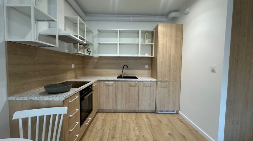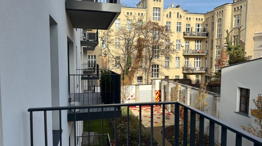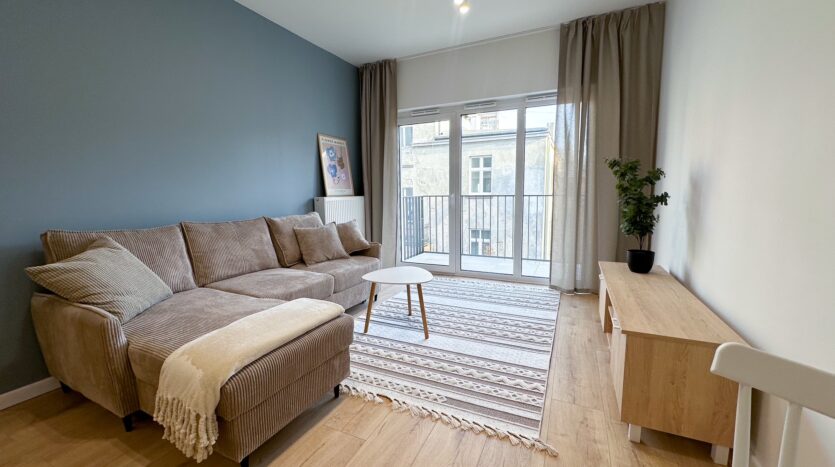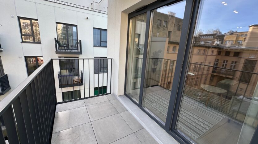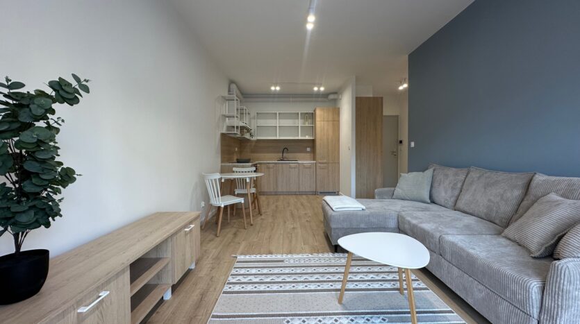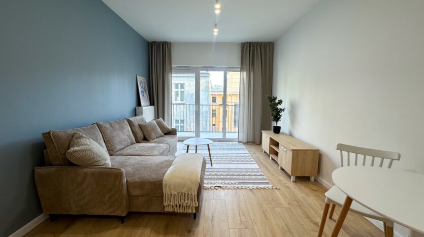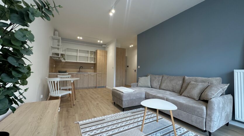 The 42 m² apartment is located on the 2nd floor (with elevator) in the new “Strefa Progress” apartment building on Kościuszki 130 Avenue in Łódź.
