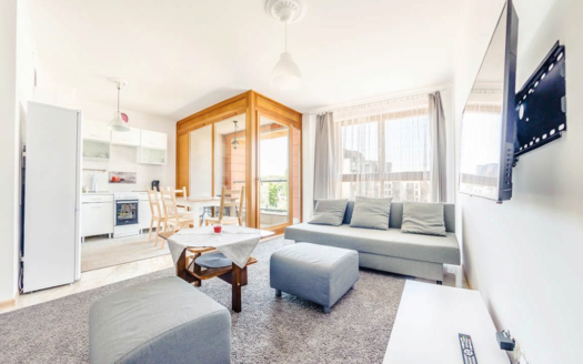Features: double sofa bed, dining table, chairs, flat screen TV (full HD, 40″), coffee table, wardrobe, double bed, drawer.