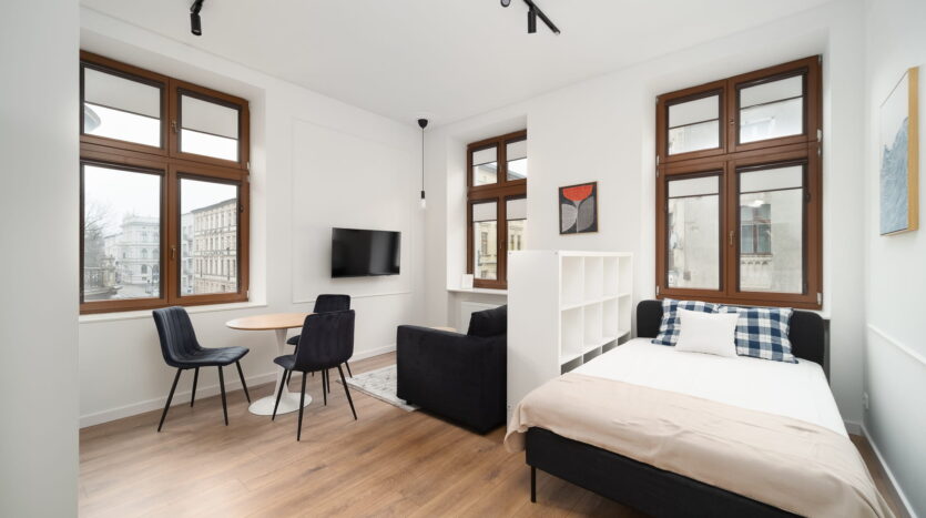 A studio apartment for rent, approximately 33m², located on the 2nd floor of a beautiful, renovated tenement building at 1 Maja Street 11 in Łódź, right across from the Academy of Music.