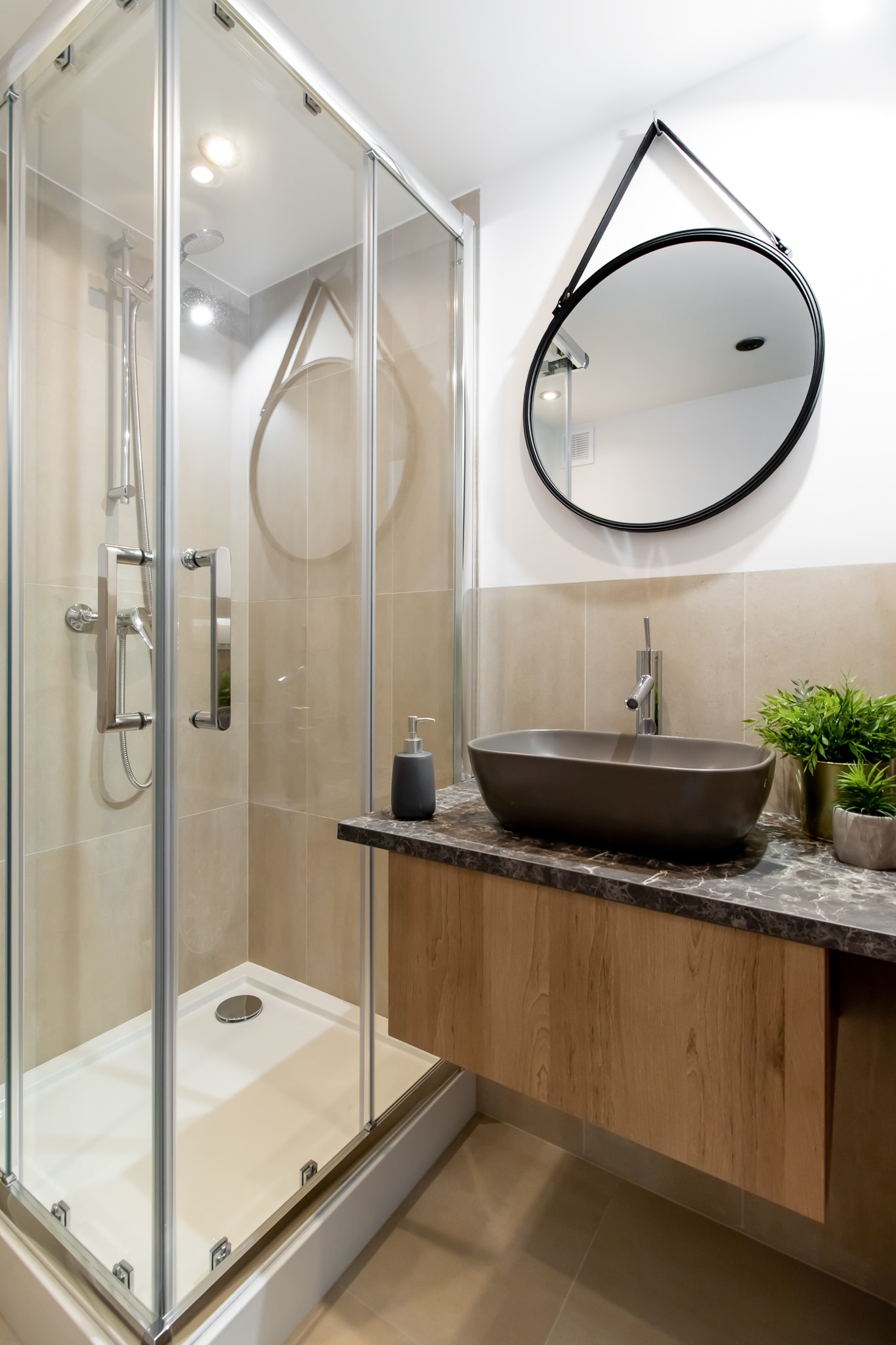 Living room with sofa-bed, kitchen annex, bathroom with shower.