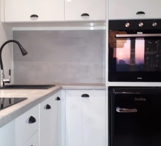 Open kitchen equipped with an electric hob, extractor hood, oven, and fridge with freezer