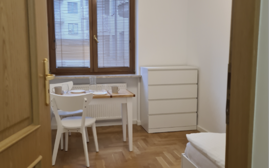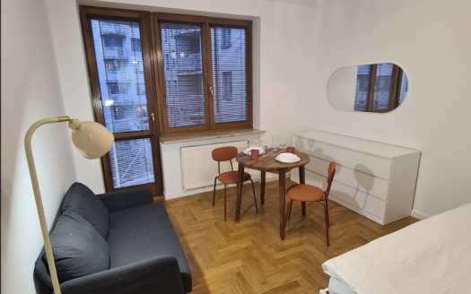 The studio features a bright and spacious fully furnished room with a comfortable fold-out sofa.