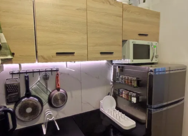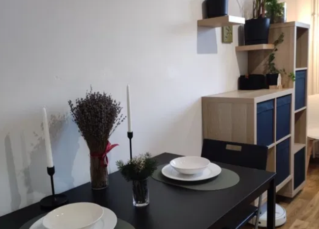 The studio features a bright and spacious fully furnished room with a comfortable fold-out sofa.