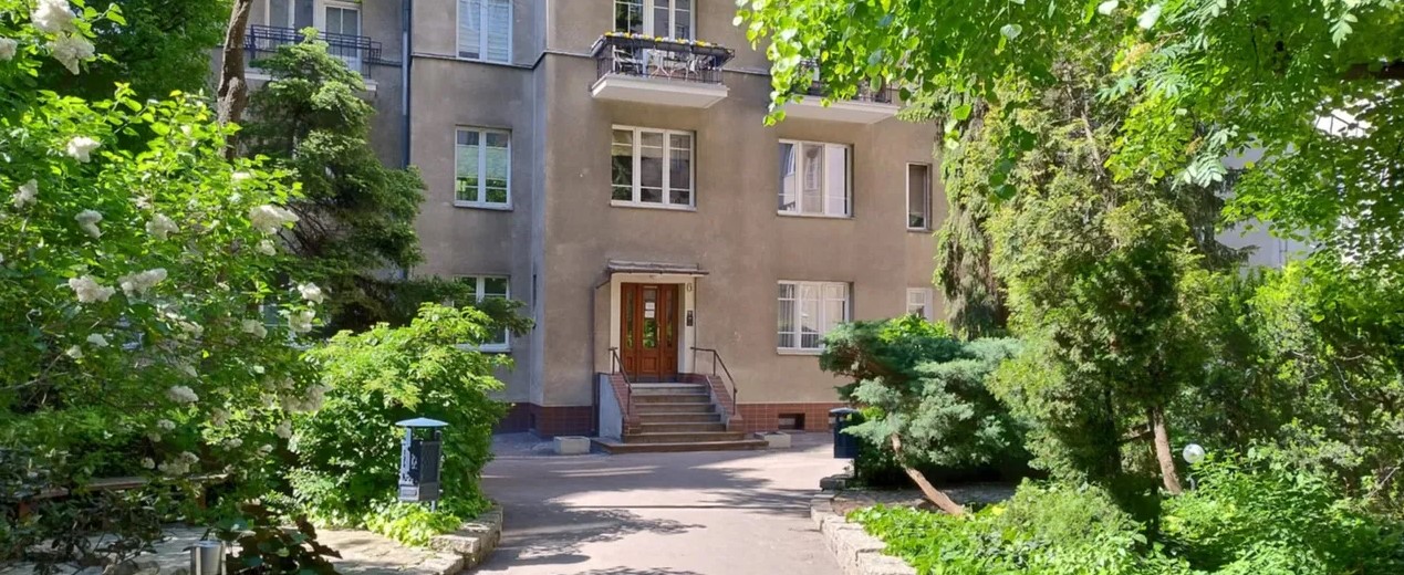 The apartment is located in a pre-war tenement building designed by Wincenty Oczykowski (1923–1931), which survived World War II almost intact.