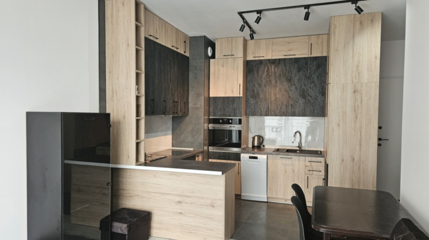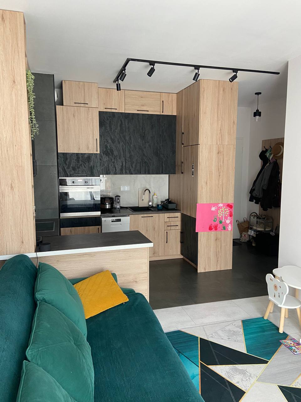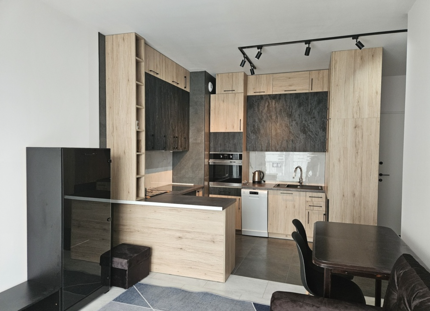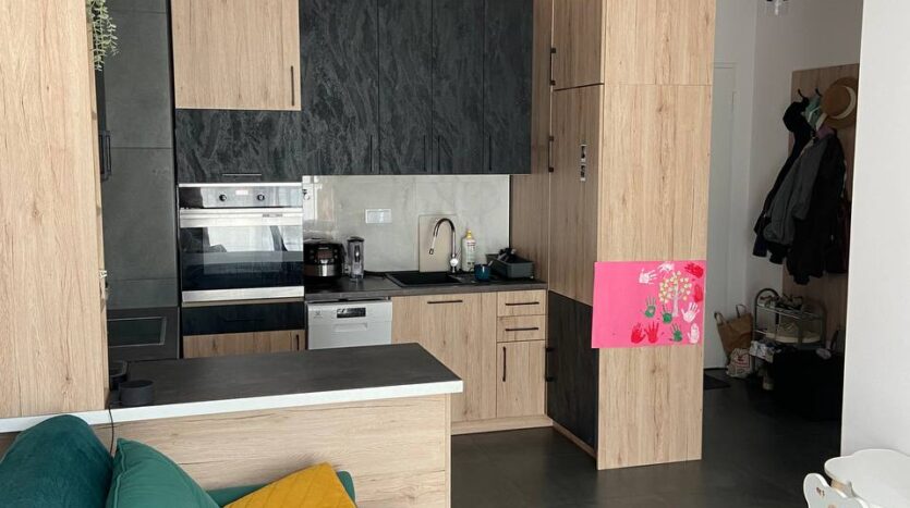 The apartment is fully furnished and equipped with household appliances: washing machine, dishwasher, oven, induction hob, fridge with freezer, and extractor hood. The kitchen and bedroom built-in furniture provide plenty of storage space.
