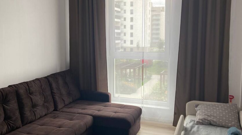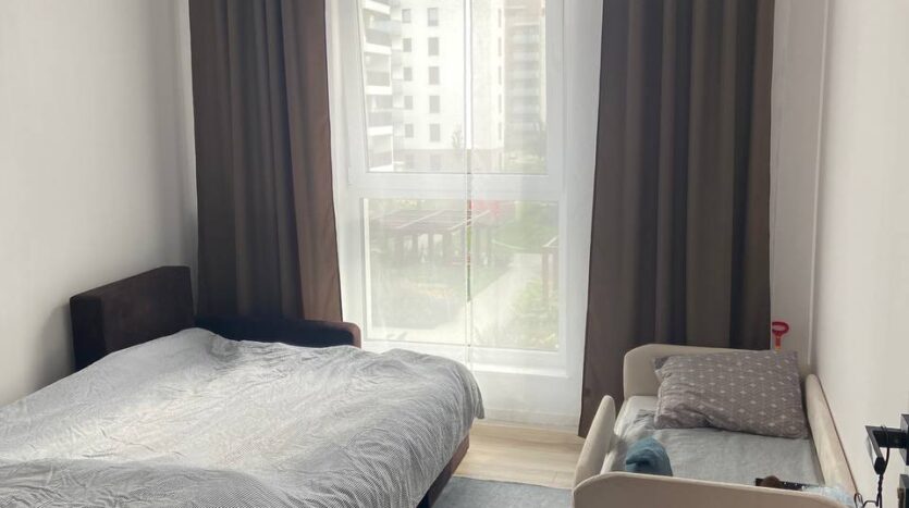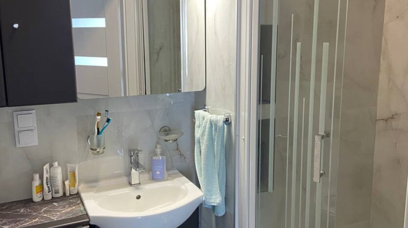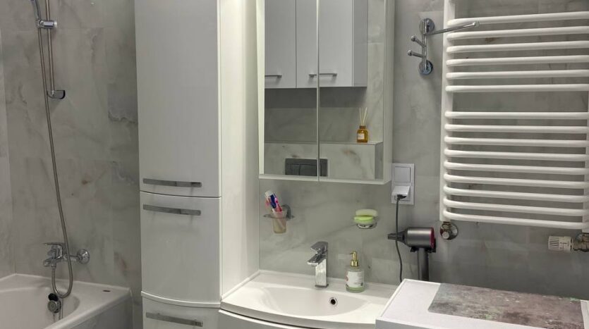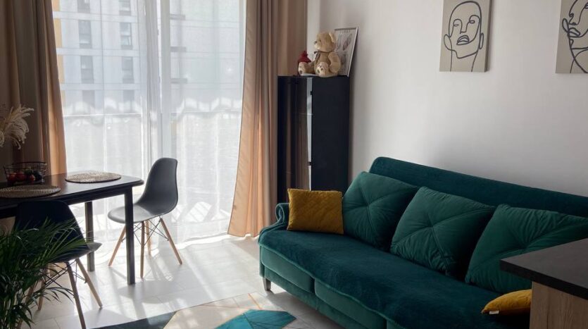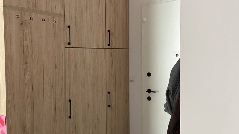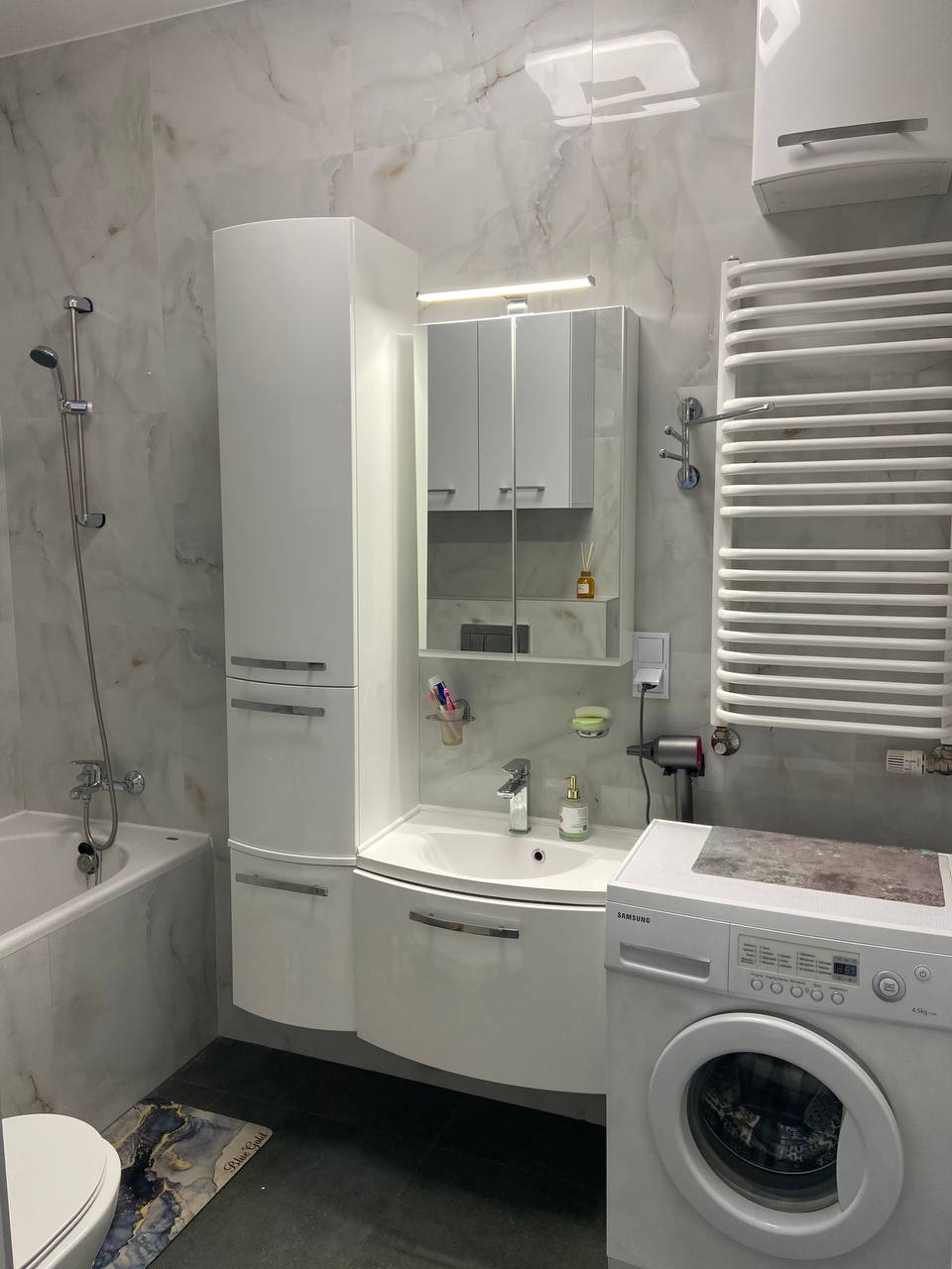 The apartment is fully furnished and equipped with household appliances: washing machine, dishwasher, oven, induction hob, fridge with freezer, and extractor hood. The kitchen and bedroom built-in furniture provide plenty of storage space.