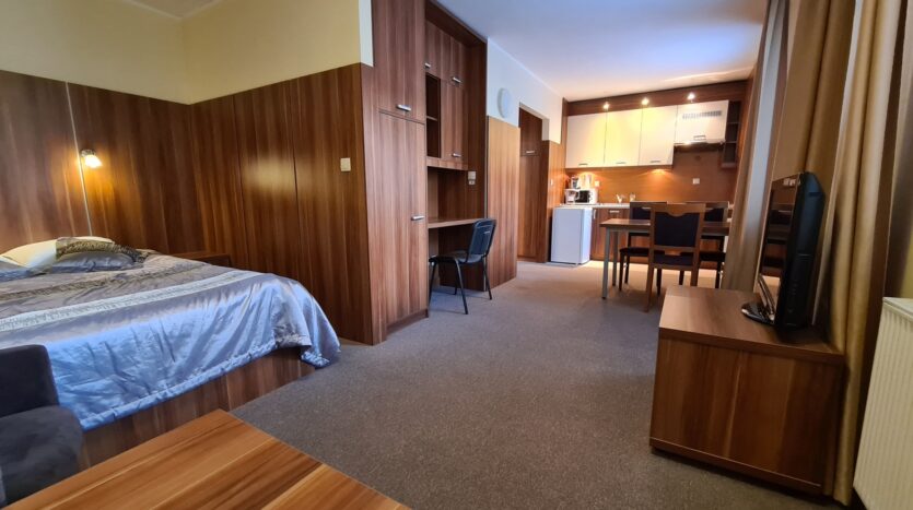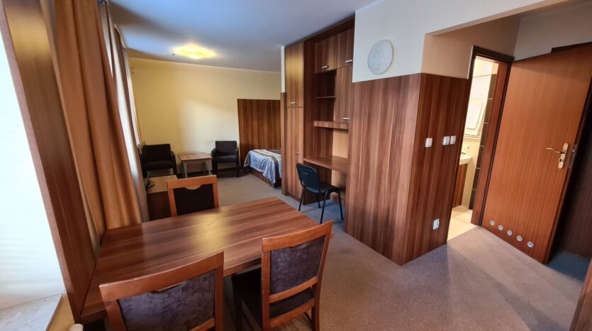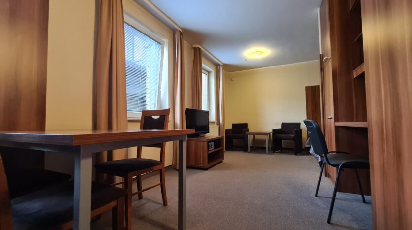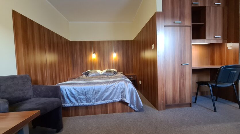 The flat is fully furnished and equipped. Amenities include a large wardrobe, TV, refrigerator, washing machine, work desk, bed with mattress, ironing board, iron, and clothes dryer. It is ready to move in without the need for any additional expenses.