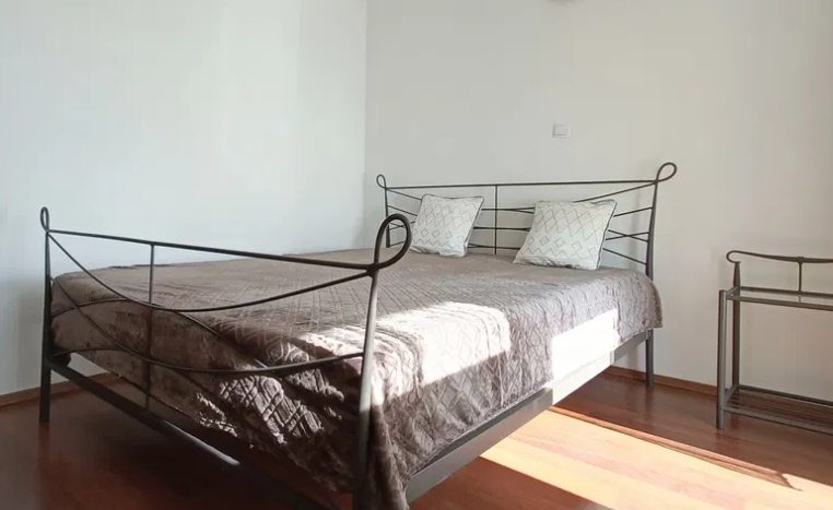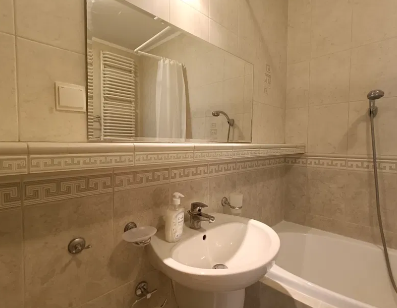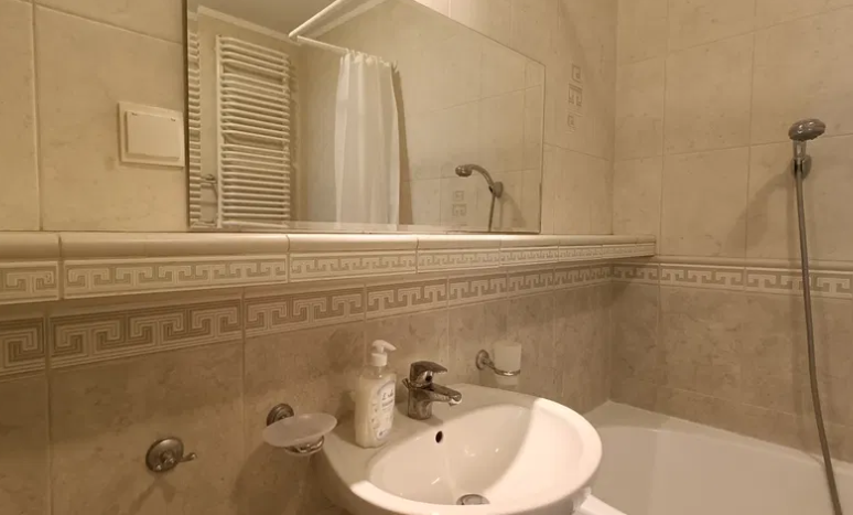 – the bathroom: bathtub, sink, washing machine.In the bedroom: comfortable bed, nightstand, large wardrobe with mirrored doors.