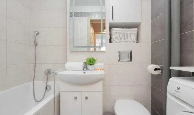 – bathroom with washing machine, bathtub with shower.