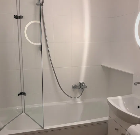 Bathroom with a bathtub,Toilet,Hall with a large built-in wardrobe.