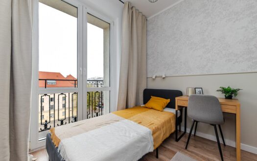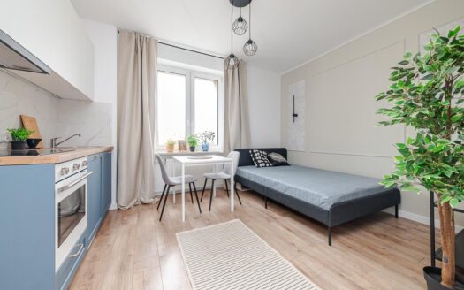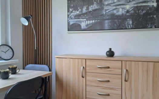 The interior boasts high ceilings (3.30 m), enhancing the sense of space. Oak herringbone parquet floors, a cosy and elegant design, large wardrobes, a velvet sofa bed, and a continental bed (160 × 200 cm) create a comfortable living environment. The apartment is equipped with a modern lighting system and high-quality appliances and fittings (Siemens, Samsung, Villeroy & Boch). The kitchen is fully equipped with a fridge, freezer, dishwasher and induction hob.