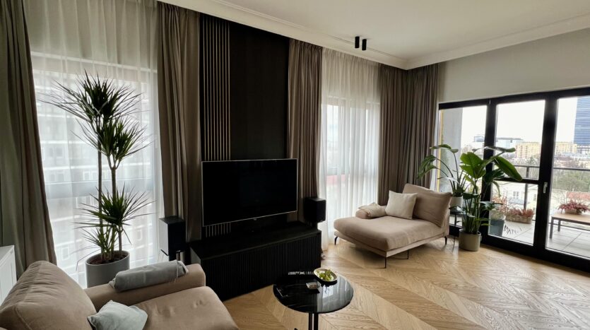 A modern, 4-room premium flat in the Wola business centre area. Located on Skierniewicka Street, within walking distance of the Wola office district (Warsaw Spire, Warsaw HUB and many other office buildings), Browary Warszawskie and Fabryka Norblina, right next to the Płocka metro station and tram line. Extremely quick access to the very centre of Warsaw.