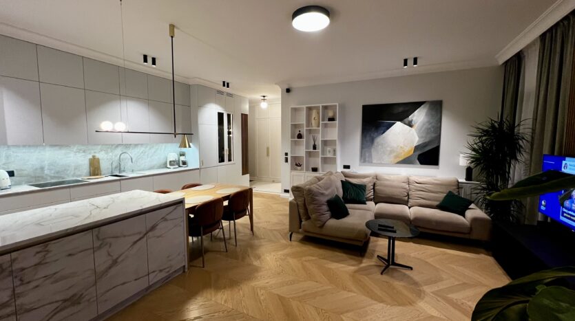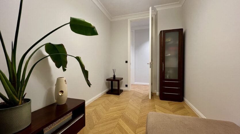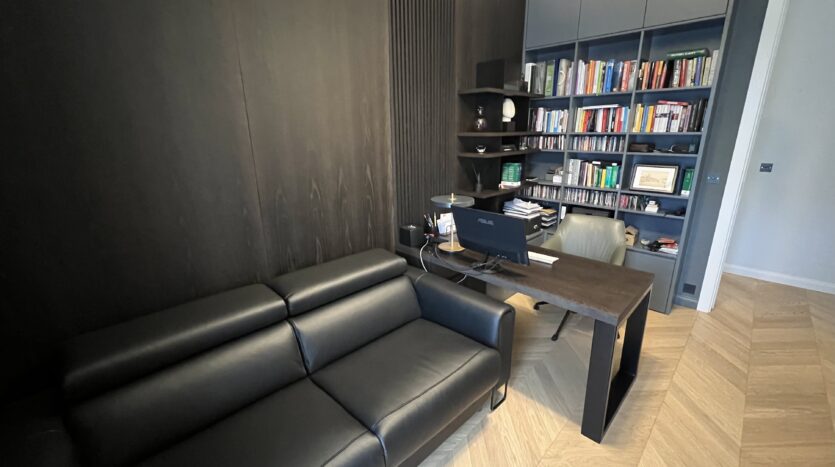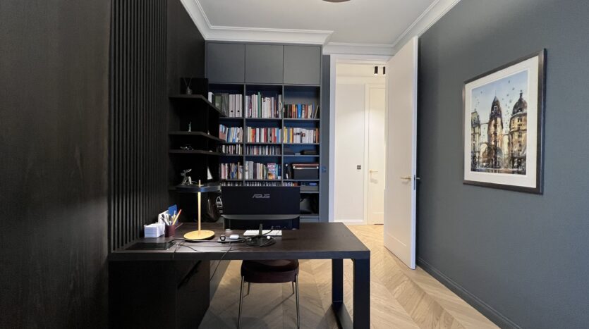 The flat is extremely spacious (3.05 m high) – living room connected to the kitchen (approx. 39 sq m), separate bedroom area connected to a wardrobe and master bathroom with bathtub, guest bathroom with shower, utility room, 2 additional rooms (1 furnished as a home office with a bedroom function + an additional room with the possibility of arranging another bedroom).