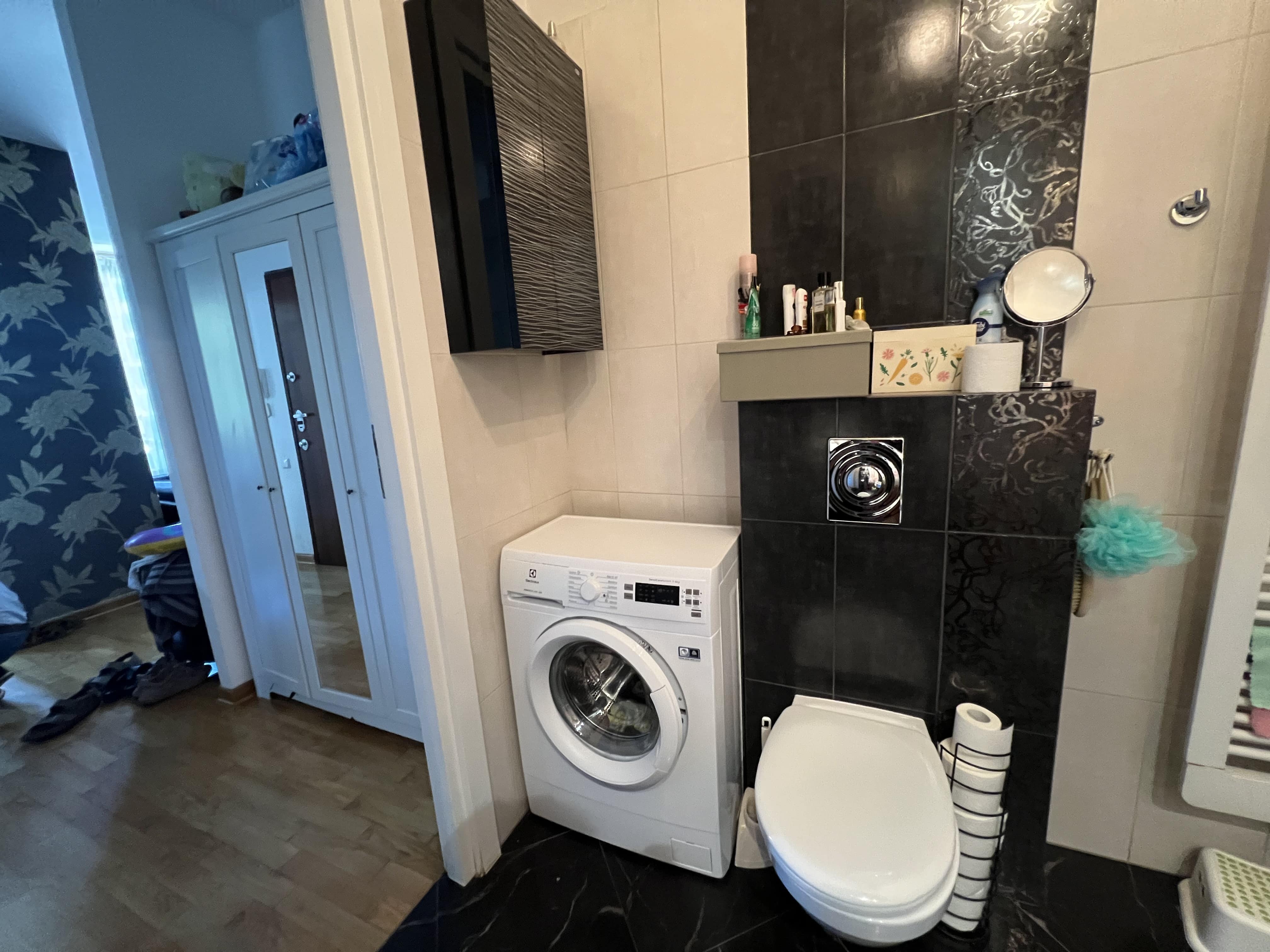 The bathroom is equipped with a bathtub, washing machine, toilet.