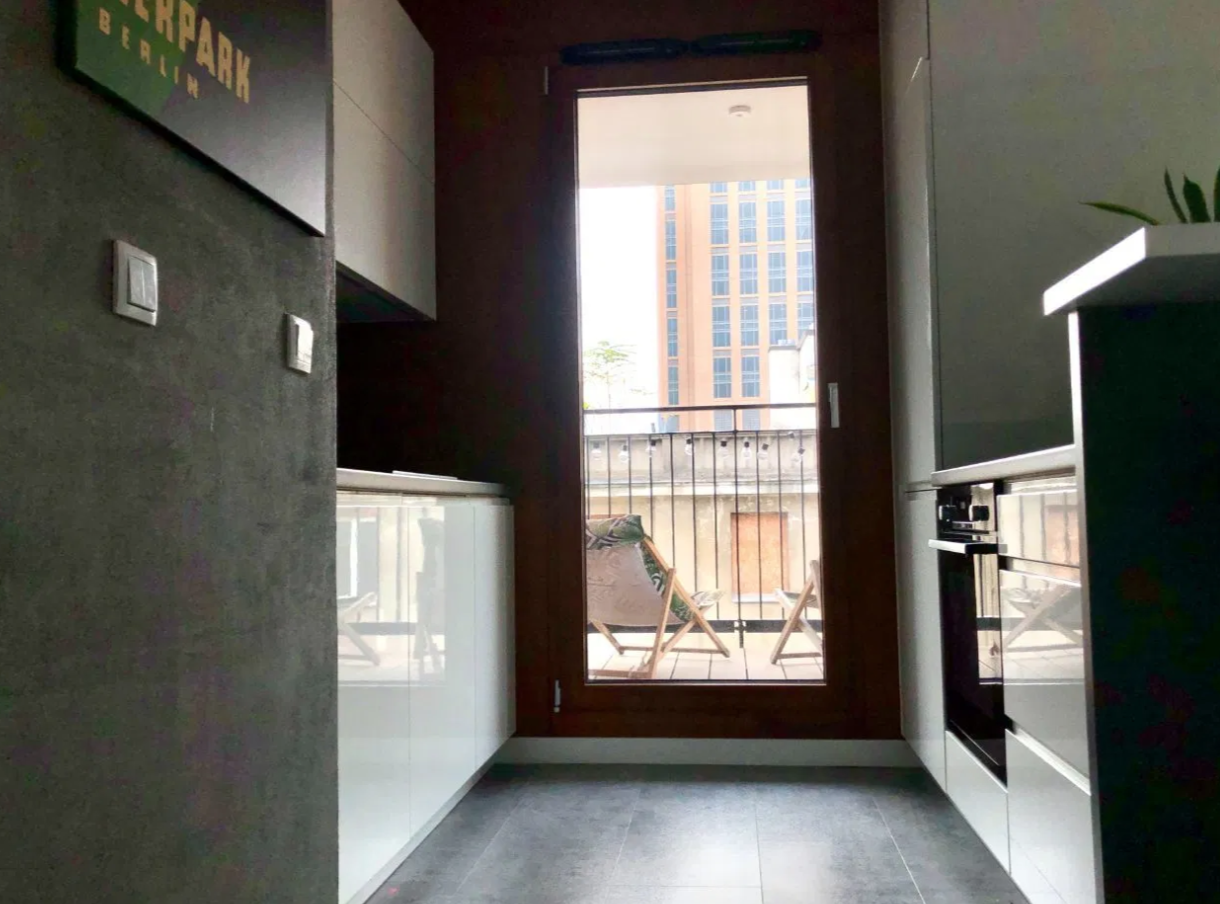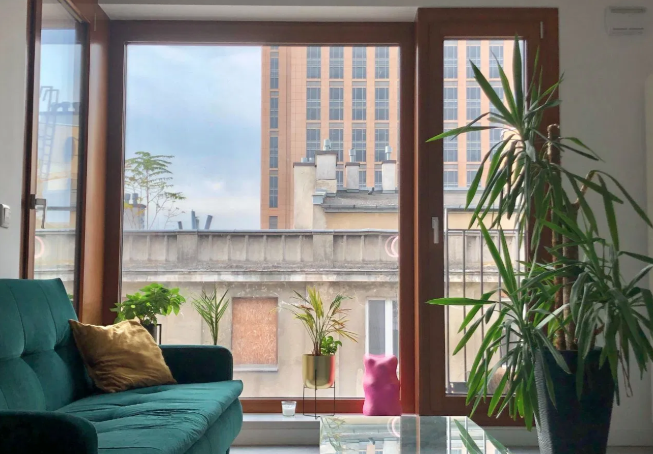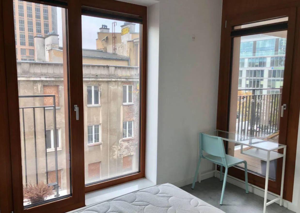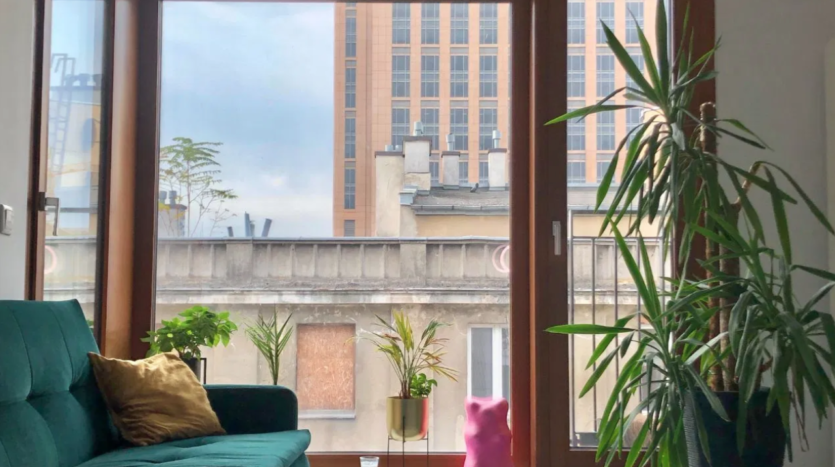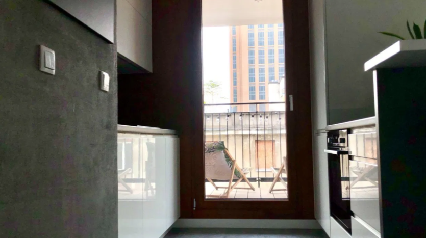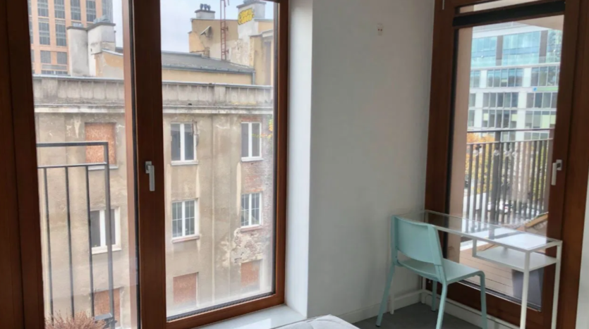 – Loggia with deck chairs and a view of Warsaw’s Downtown on Daszyńskiego
