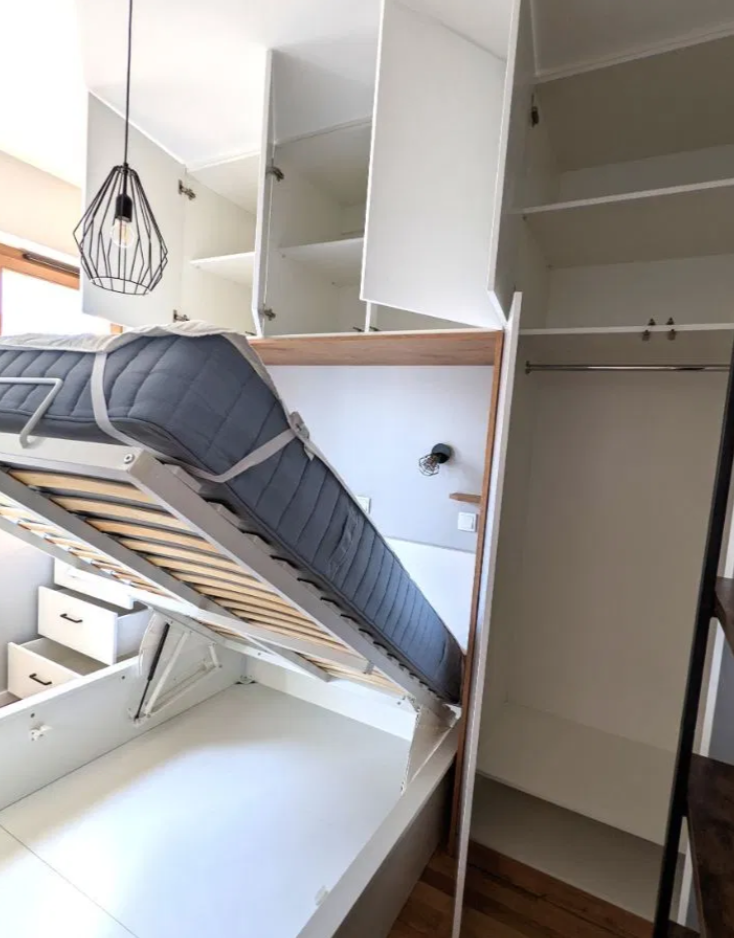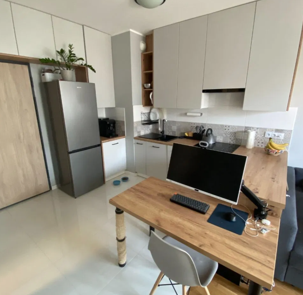 – spacious living room with wooden floor, big sofa (convertible into a bed – in case needed for guests), large table (convenient also for work from home)