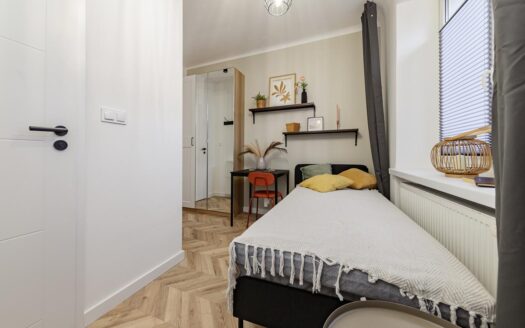 The apartment consists of two separate bedrooms – one with a double bed, and the other with a single bed. There is also a bright living area with a sofa and an open kitchen, perfect for everyday comfort. Bathroom with shower and wardrobe room for all your stuff.