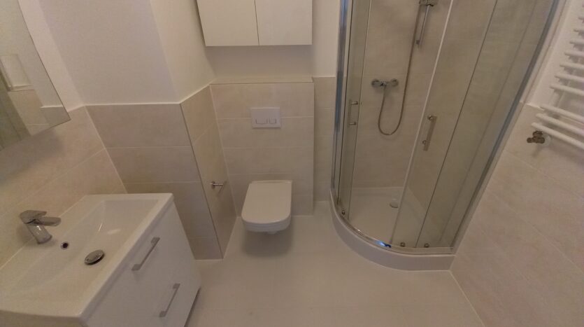 Bathroom: washing machine, shower, hanging cabinet, cabinet under the sink.