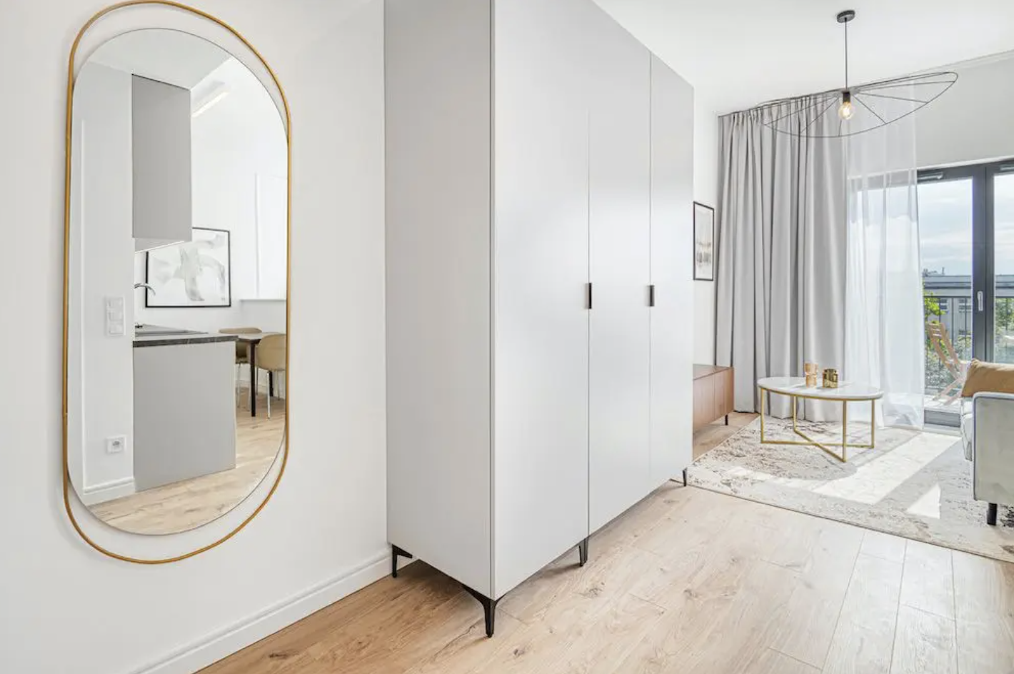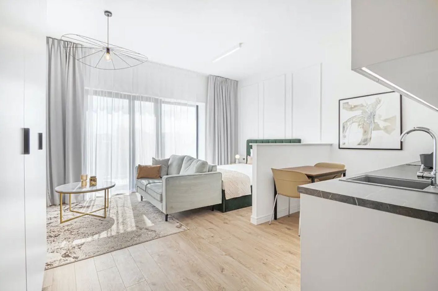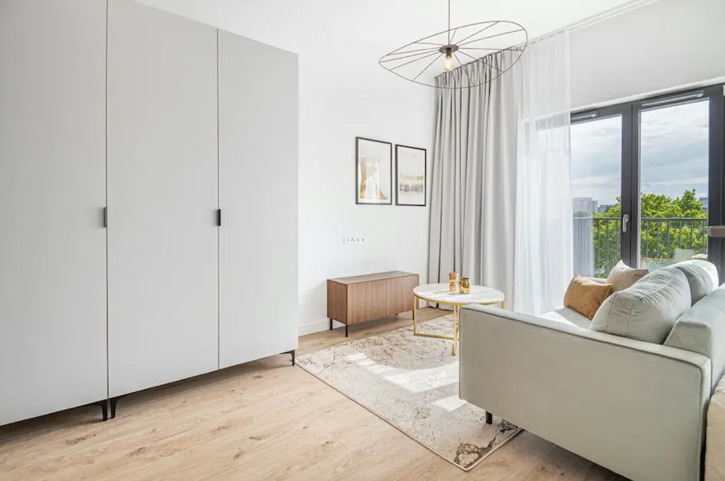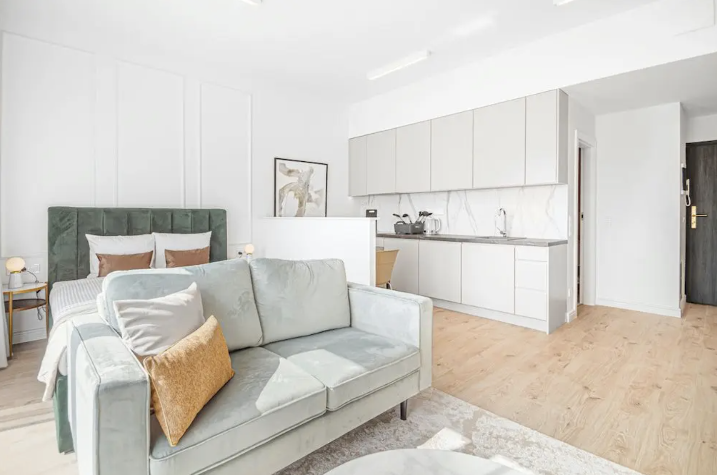 For rent a spacious studio flat located in Stanislawa Dubois Street. The apartment has thoughtfully designed space, has a living area with sofa nad double bed, kitchen annex, bathroom. The kitchen is fully equipped with a fridge, oven, induction hob, and plenty of storage.