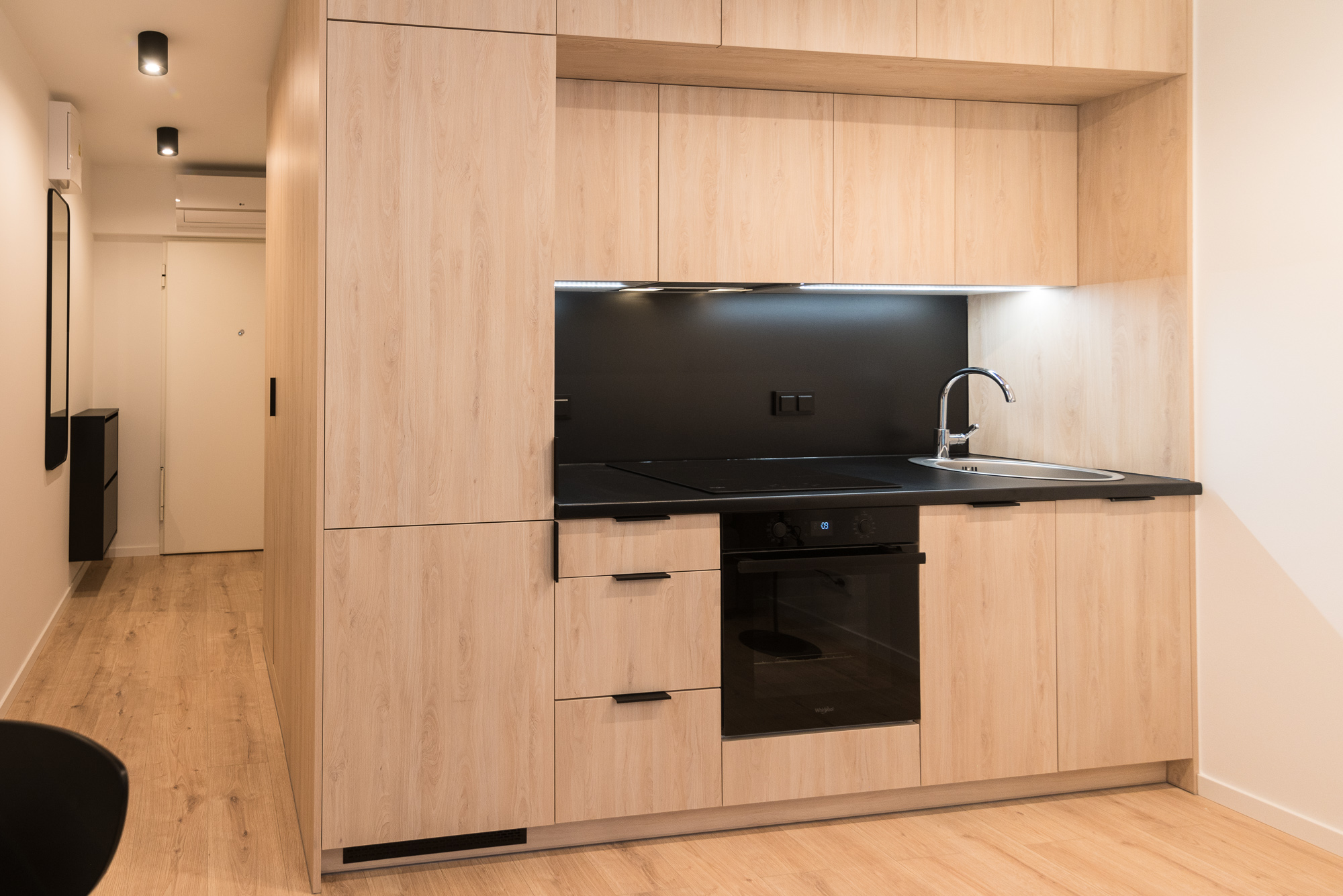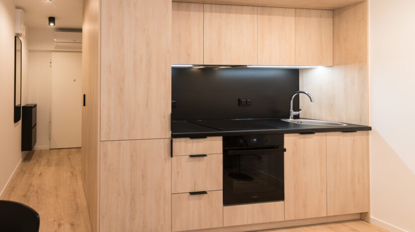 Kitchenette: hob, fridge-freezer, hood, dishwasher and oven.