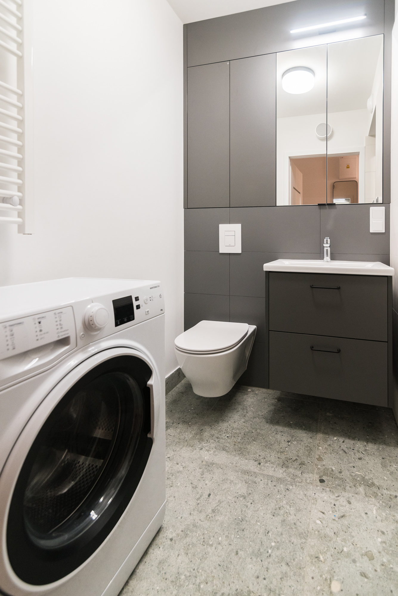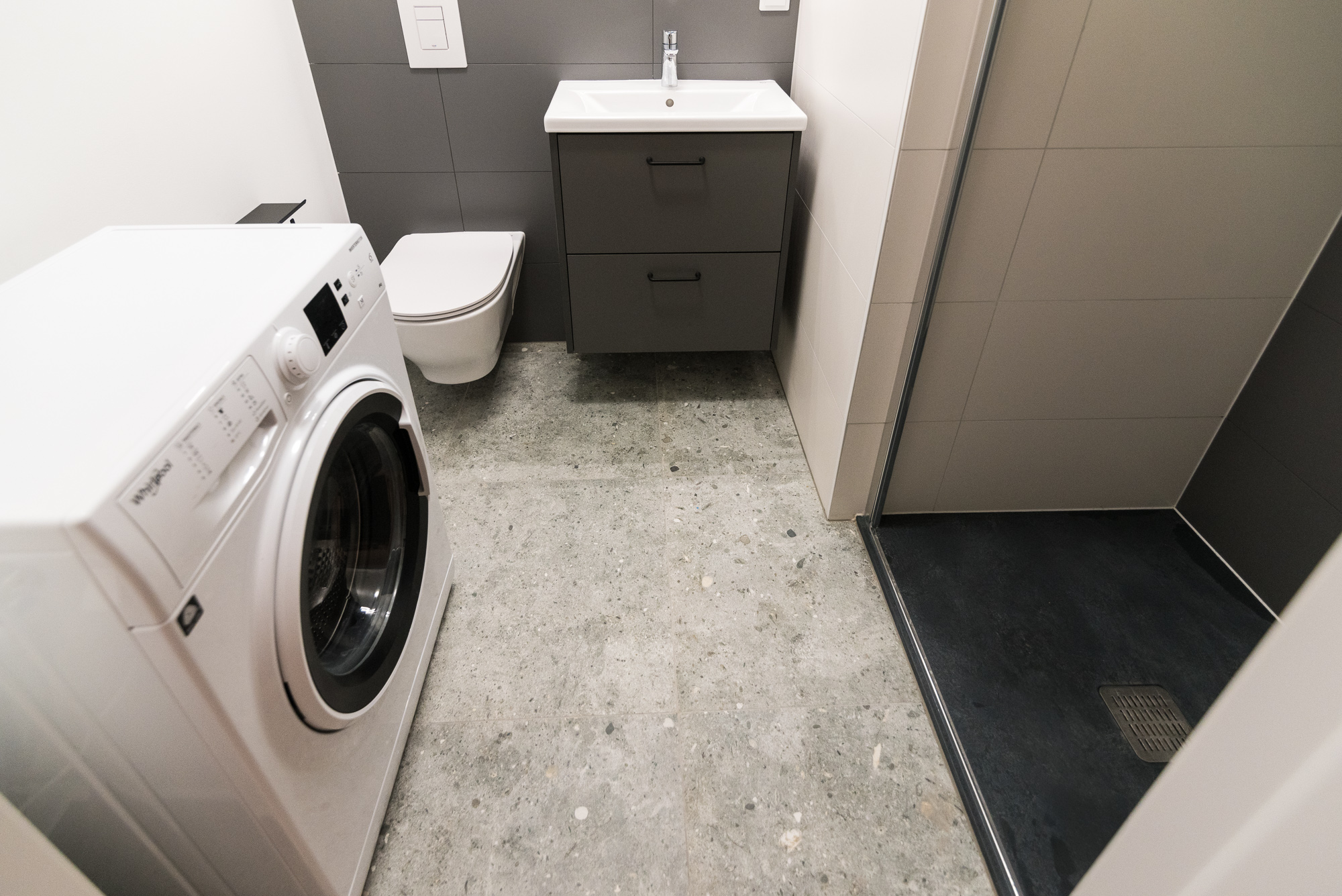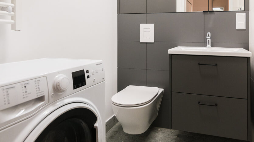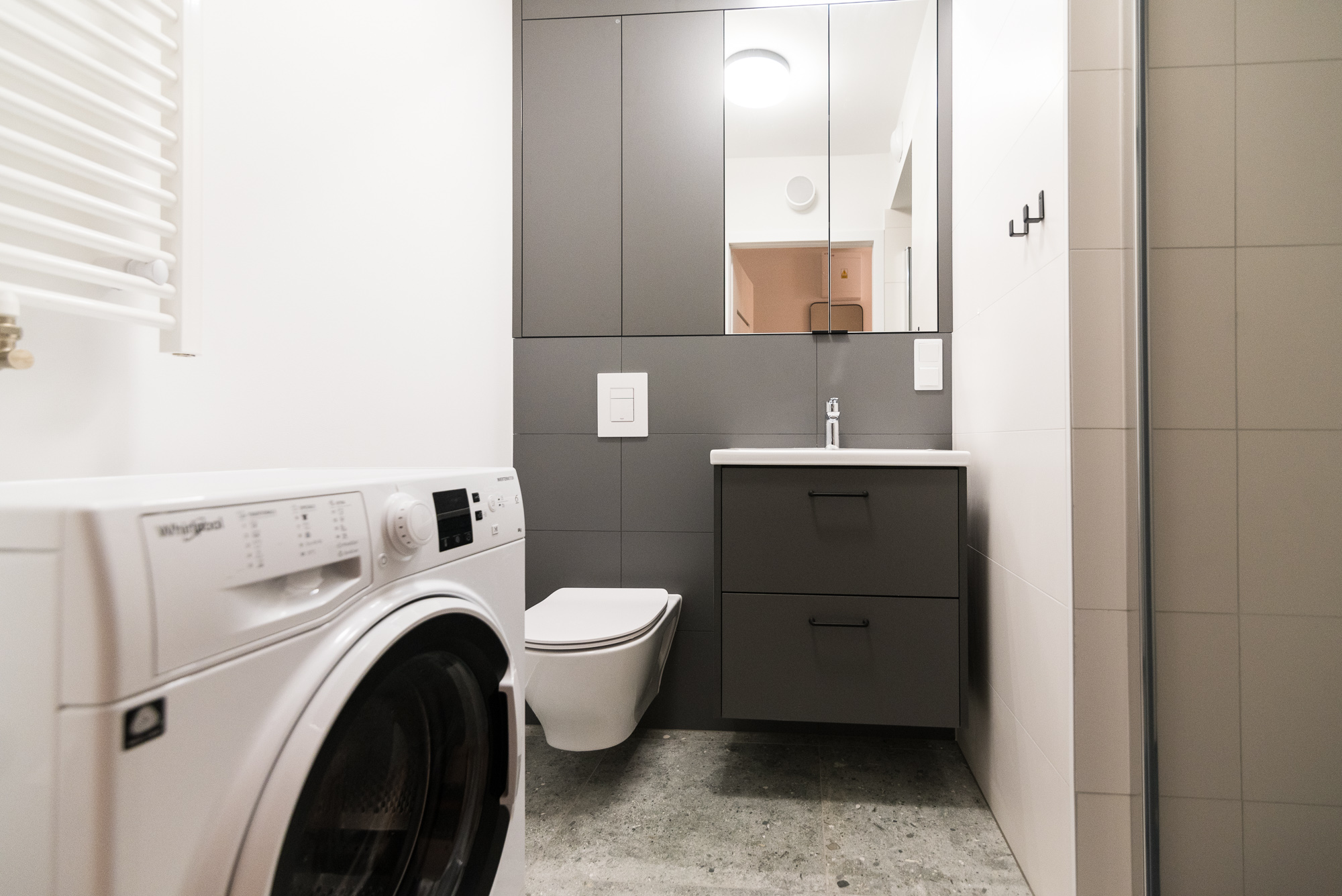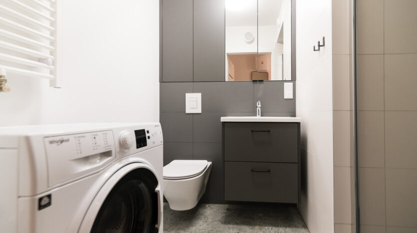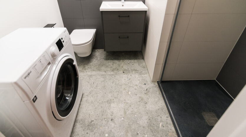 Bathroom: washing machine, shower, overhead cabinet, cabinet under the sink.
