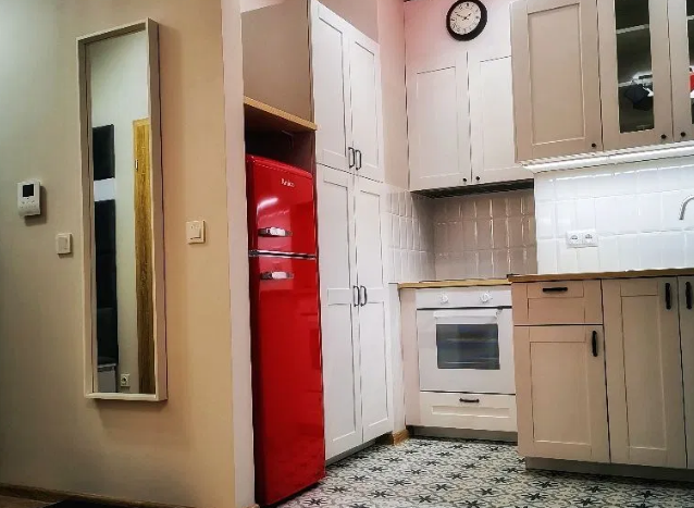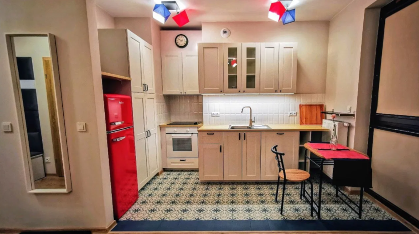 Fully equipped kitchenette with dishwasher, fridge, oven, extractor hood, dining table with chairs, vacuum cleaner, and mop