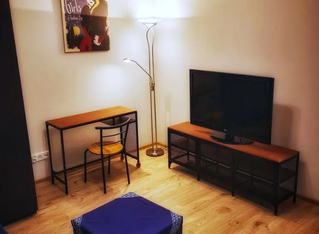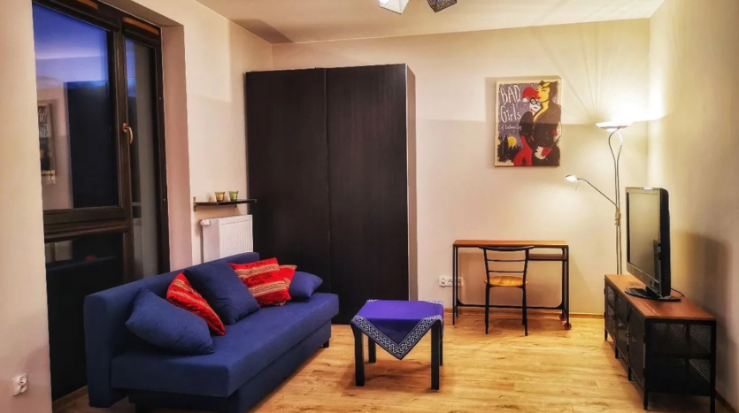 Bright living area with a comfortable sofa bed, wardrobe, desk, TV stand with a 40” TV