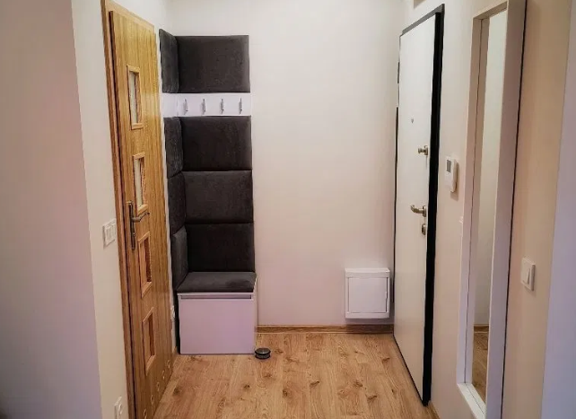 Hallway with shoe cabinet, seating area with backrest and hooks, and mirror