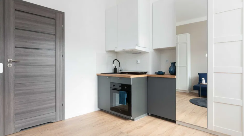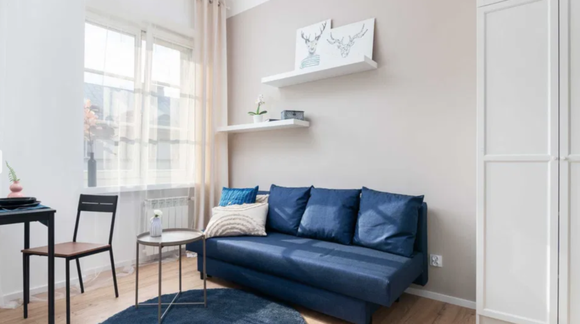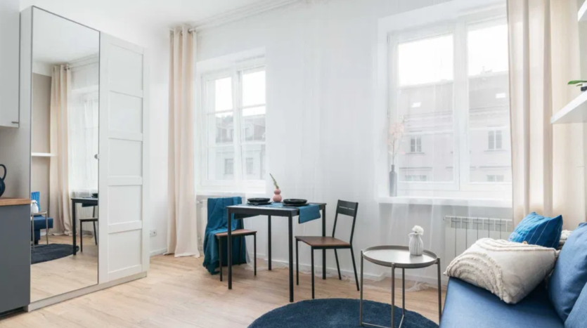 A stylish, well-equipped studio with a kitchen in the annex, located on the most representative street in Warsaw. Right next to the metro station. Apartment on the second floor, well-lit, well-designed, fully furnished and equipped.