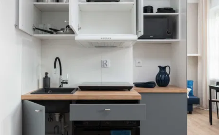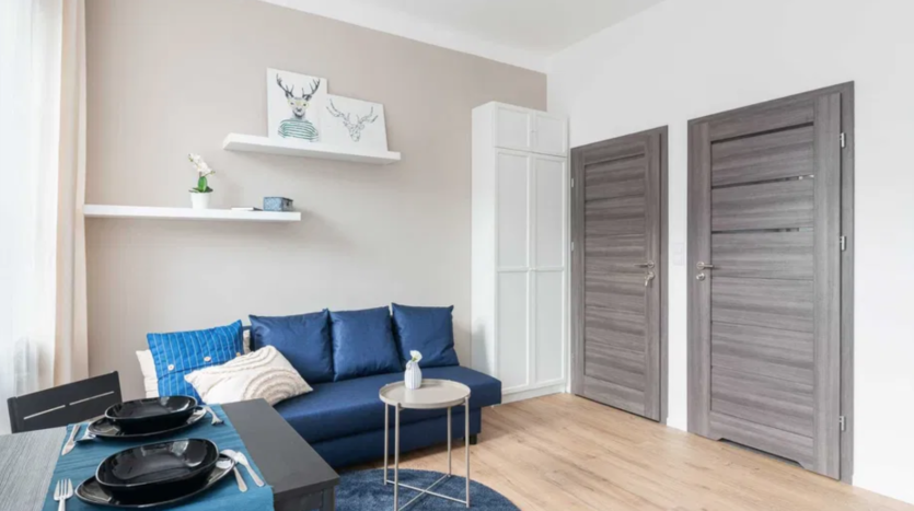Two large wardrobes, a very comfortable sofa, a coffee table, and a dining and work table. Comfortable, unfolding sofa 140×200 cm. In the kitchen, all the necessary equipment, including an OVEN, microwave oven, fridge, induction hob and kettle. In addition, a washing machine, clothes dryer, ironing board and iron. Bathroom with shower.