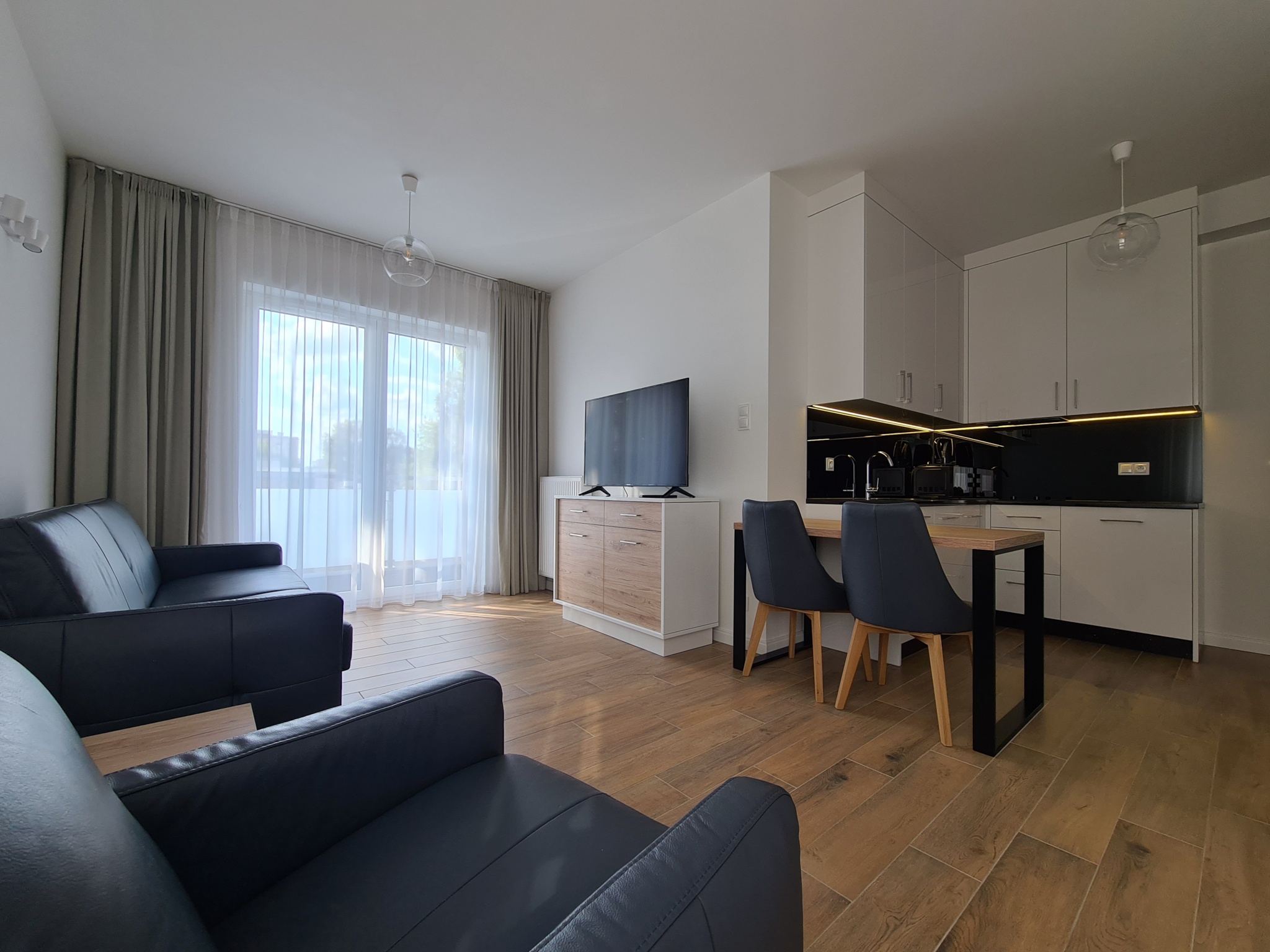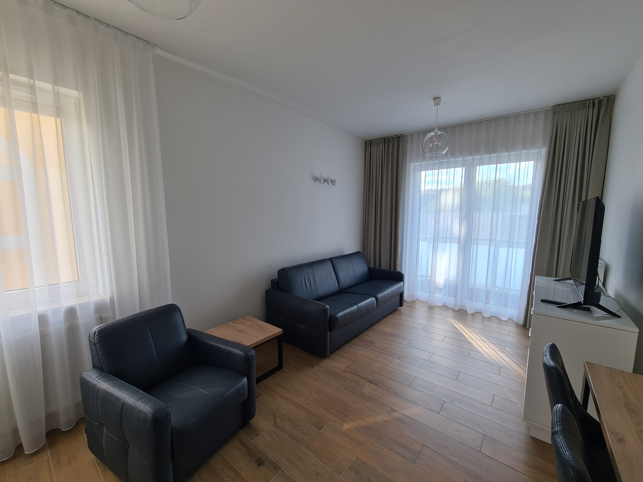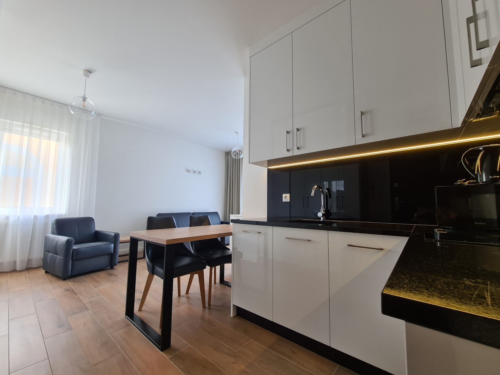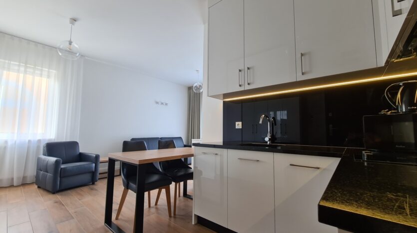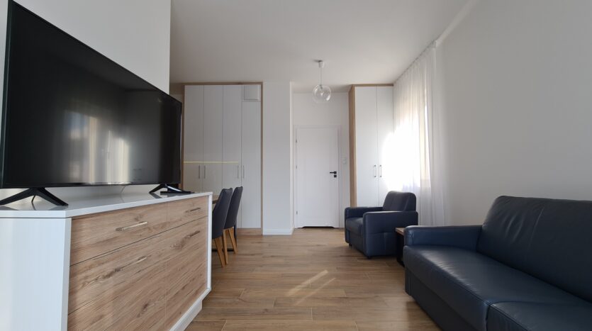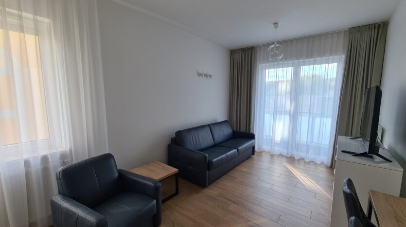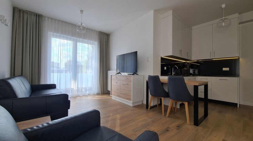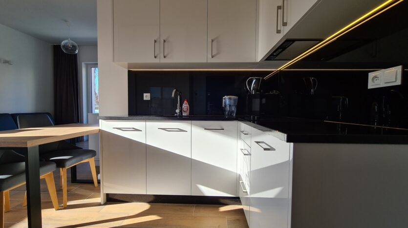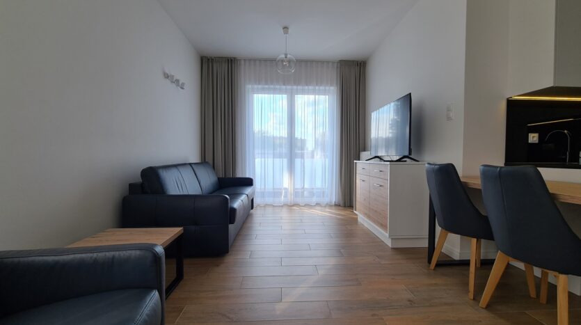 The apartment is finished to a high standard, featuring a kitchen with granite countertops, high-quality leather sofa, wooden furniture, and much more.
