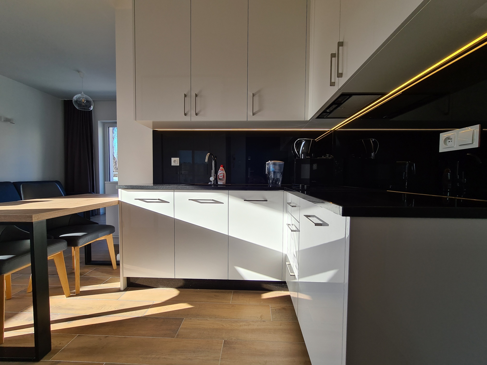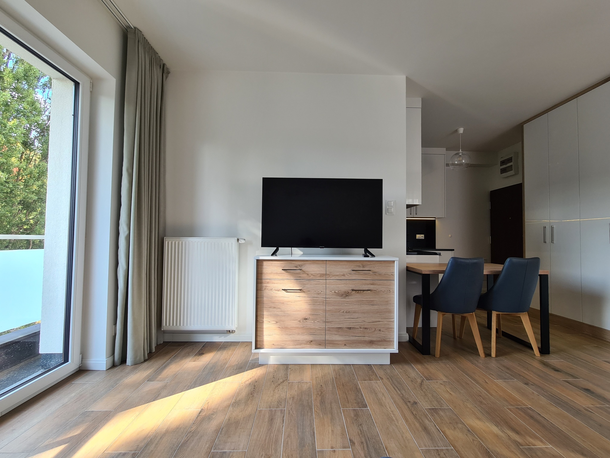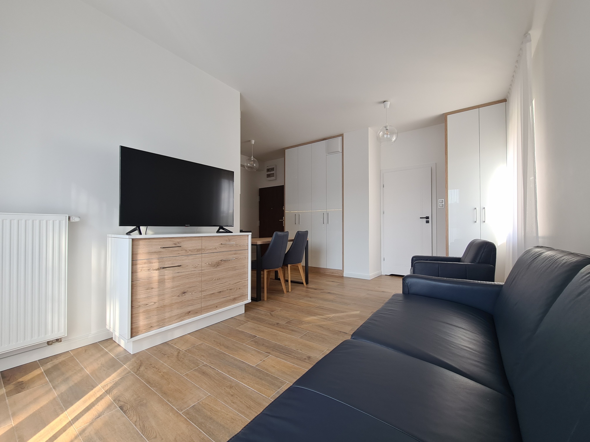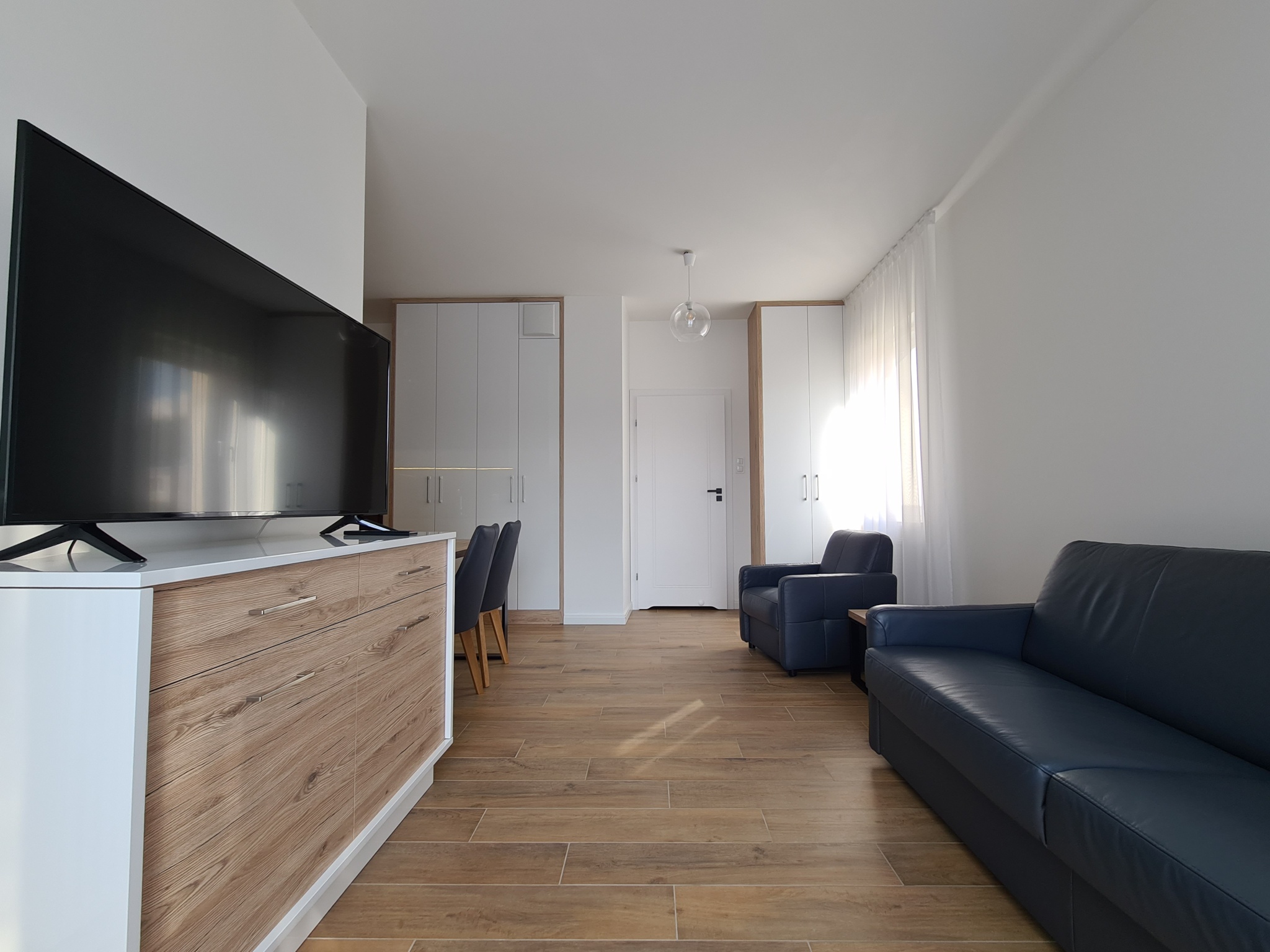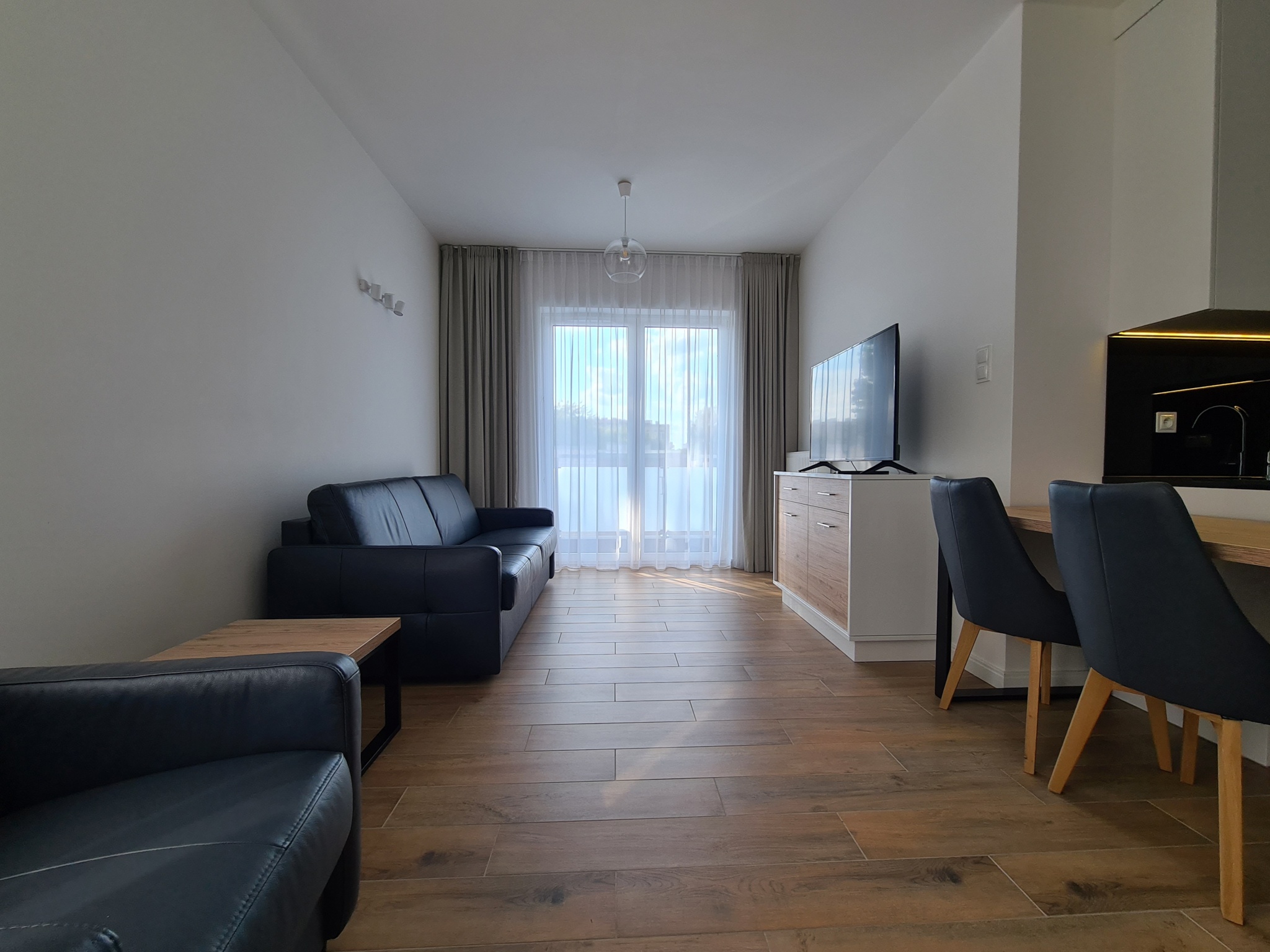 The apartment is finished to a high standard, featuring a kitchen with granite countertops, high-quality leather sofa, wooden furniture, and much more.