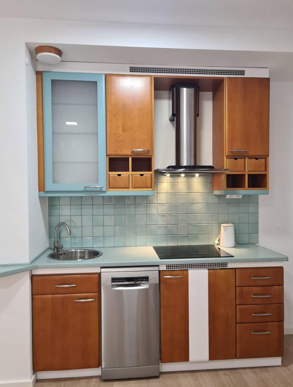 · a custom-made kitchenette featuring a built-in under-counter fridge (82 cm high), a Siemens three-zone induction hob, a Bosch washing machine, and all essential kitchenware (cutlery, glasses, plates, pan, pot, etc.);
