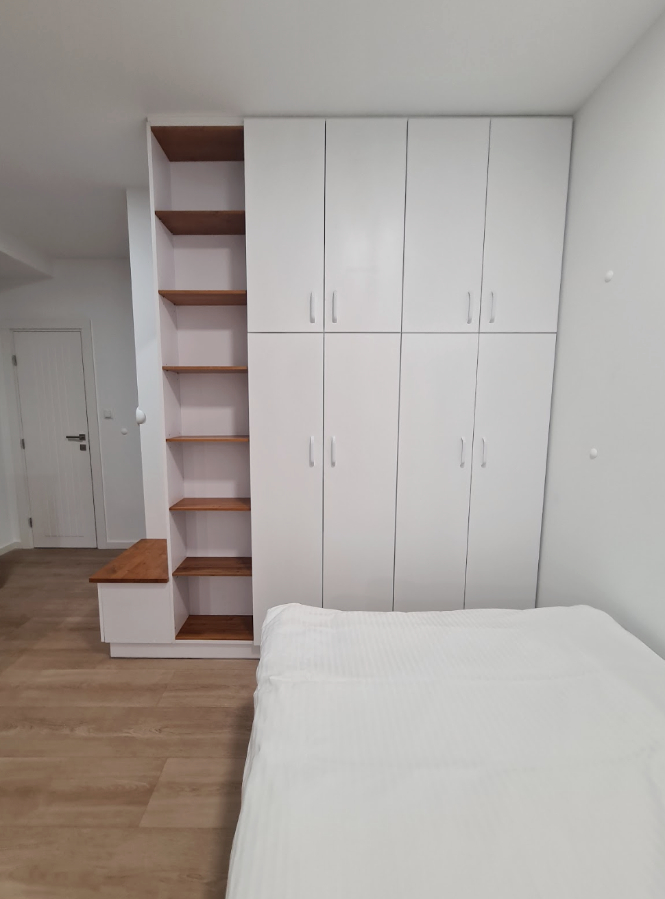 · a spacious living room with a large bed (120 x 200 cm) with built-in storage, a large two-level custom-made wardrobe with a shoe cabinet, a wooden table with two chairs, floor lamp, and a sofa with a low side cabinet next to it;