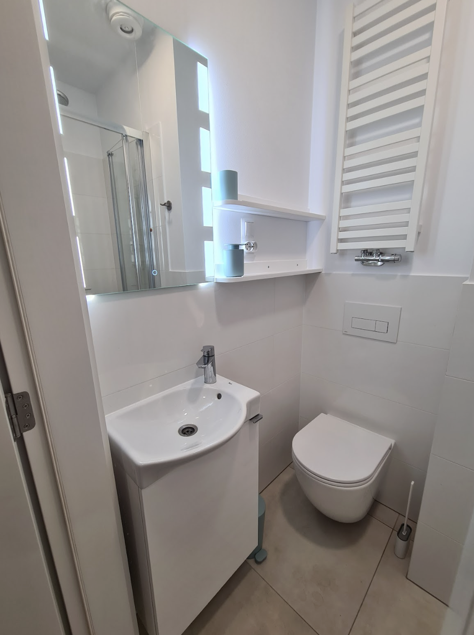 In the apartment, there is also a separate utility room (shared with four other studios) equipped with a washbasin, a Bosch washing machine and a Bosch clothes dryer, as well as cleaning equipment, a vacuum cleaner, an iron, and an ironing board.