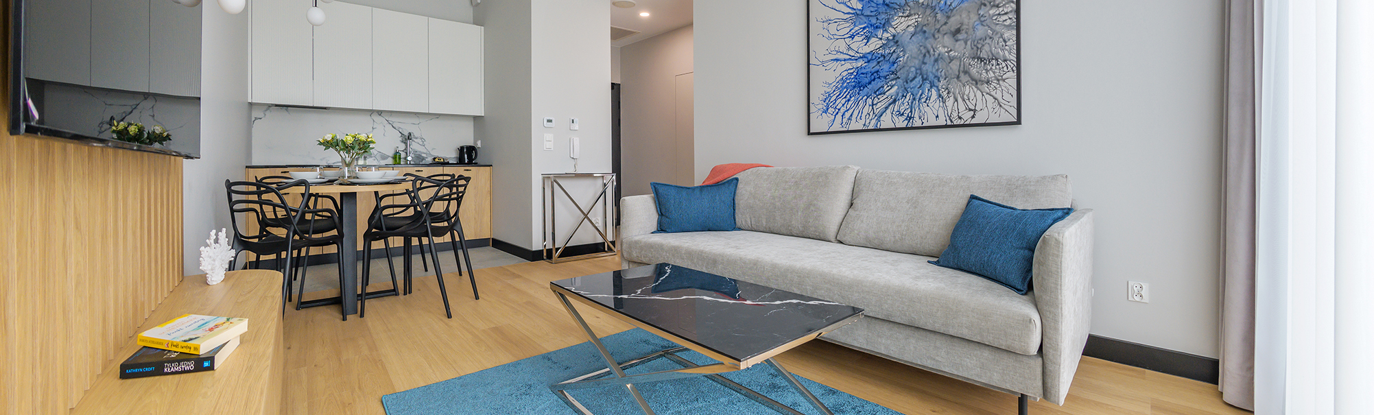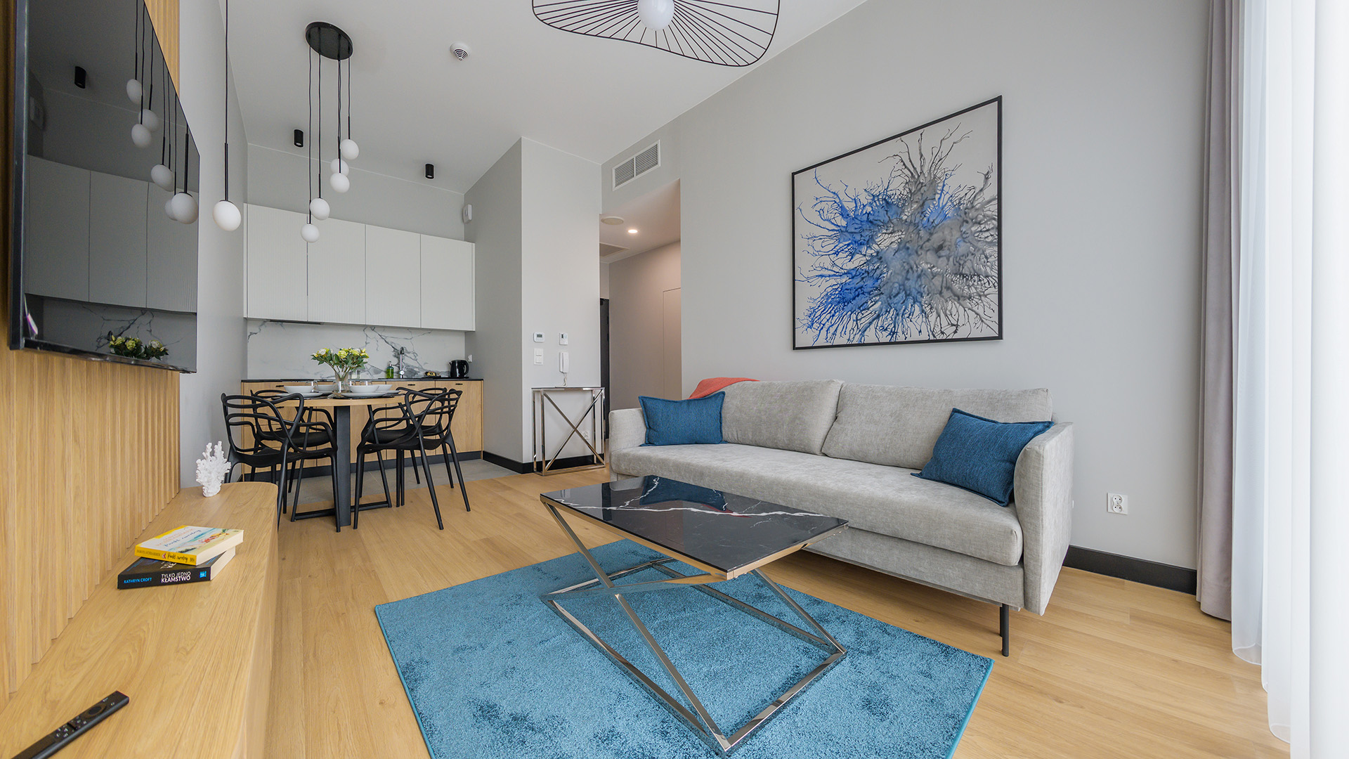 Price is 4050PLN per month for a contract of 12 months. It includes the utilities and the bills (Water, heating, Internet, electricity)