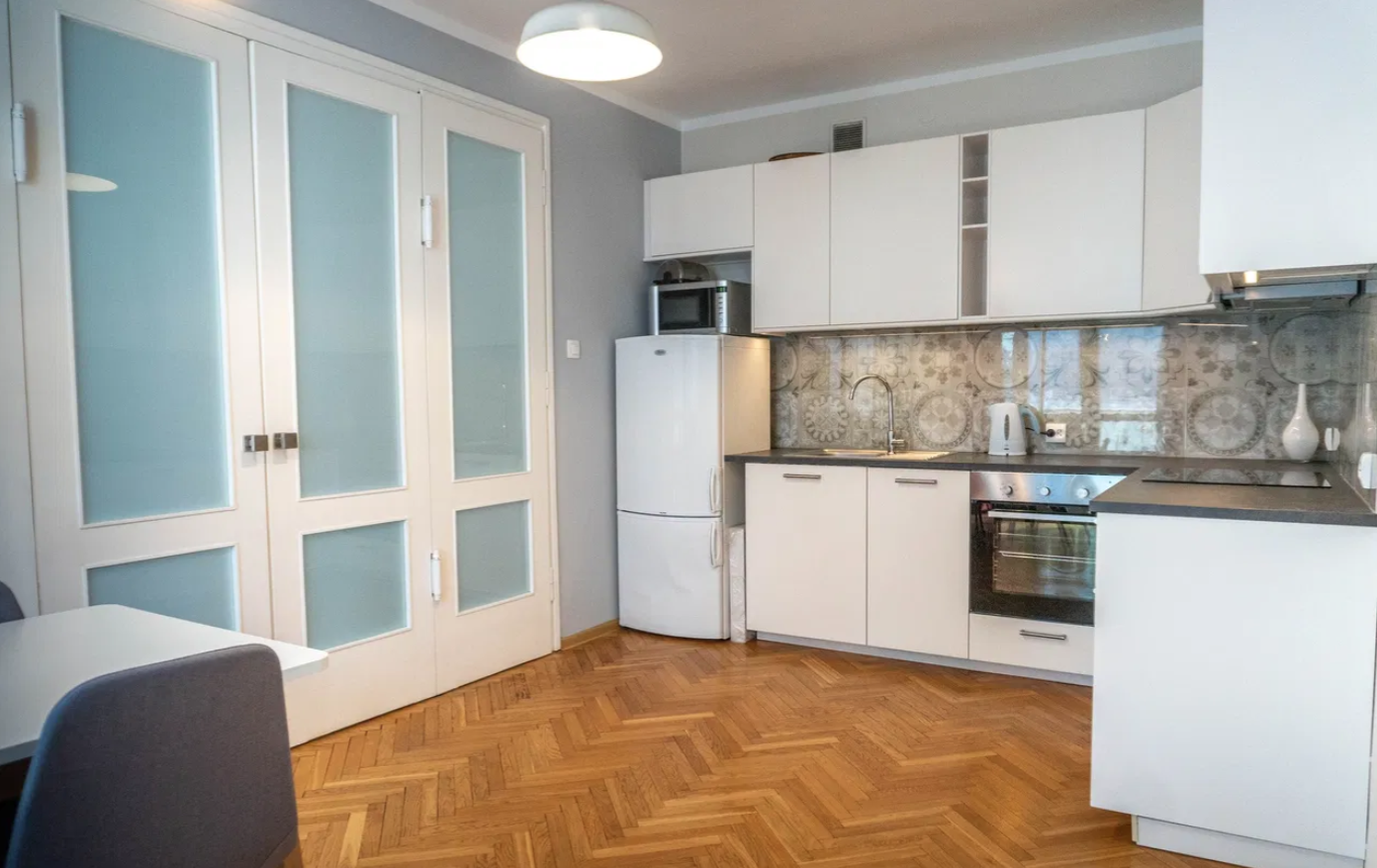 The kitchen has all necessary appliances and all equipment. Despite the center of Warsaw in the apartment is very quiet.