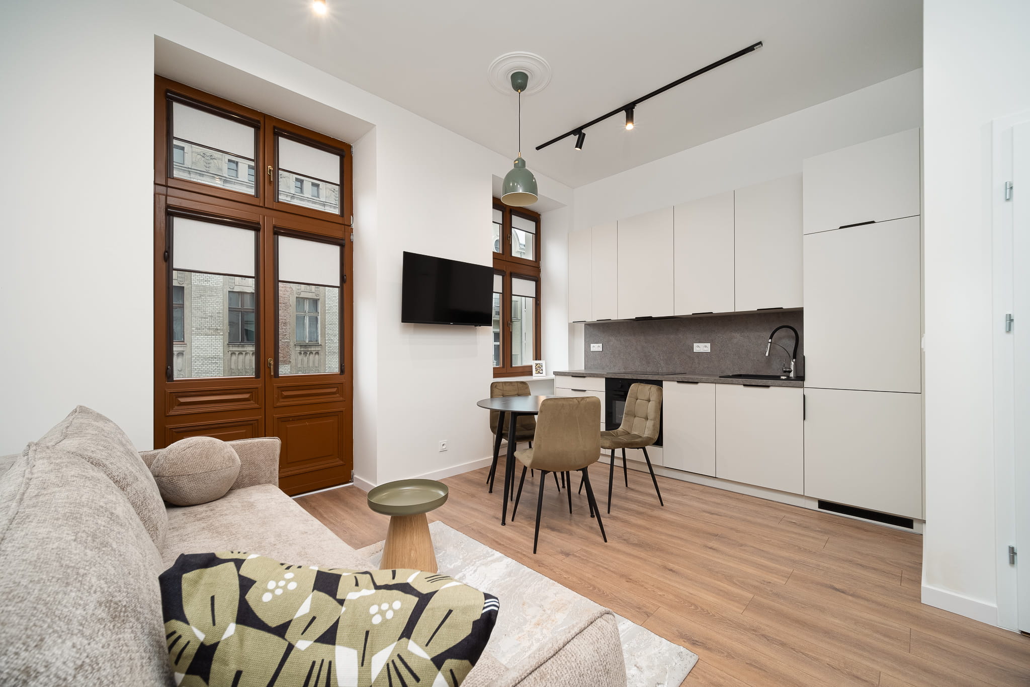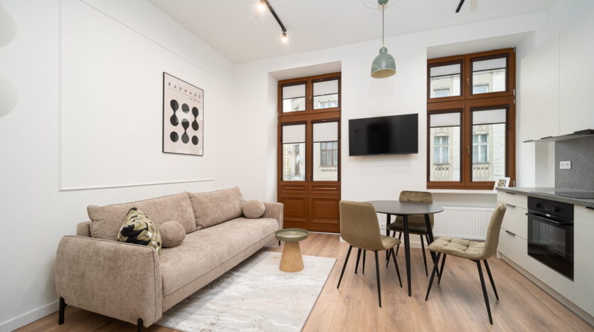 A studio apartment for rent, approximately 25m², located on the 2nd floor of a beautiful, renovated tenement building at 1 Maja Street 11 in Łódź, right across from the Academy of Music.
