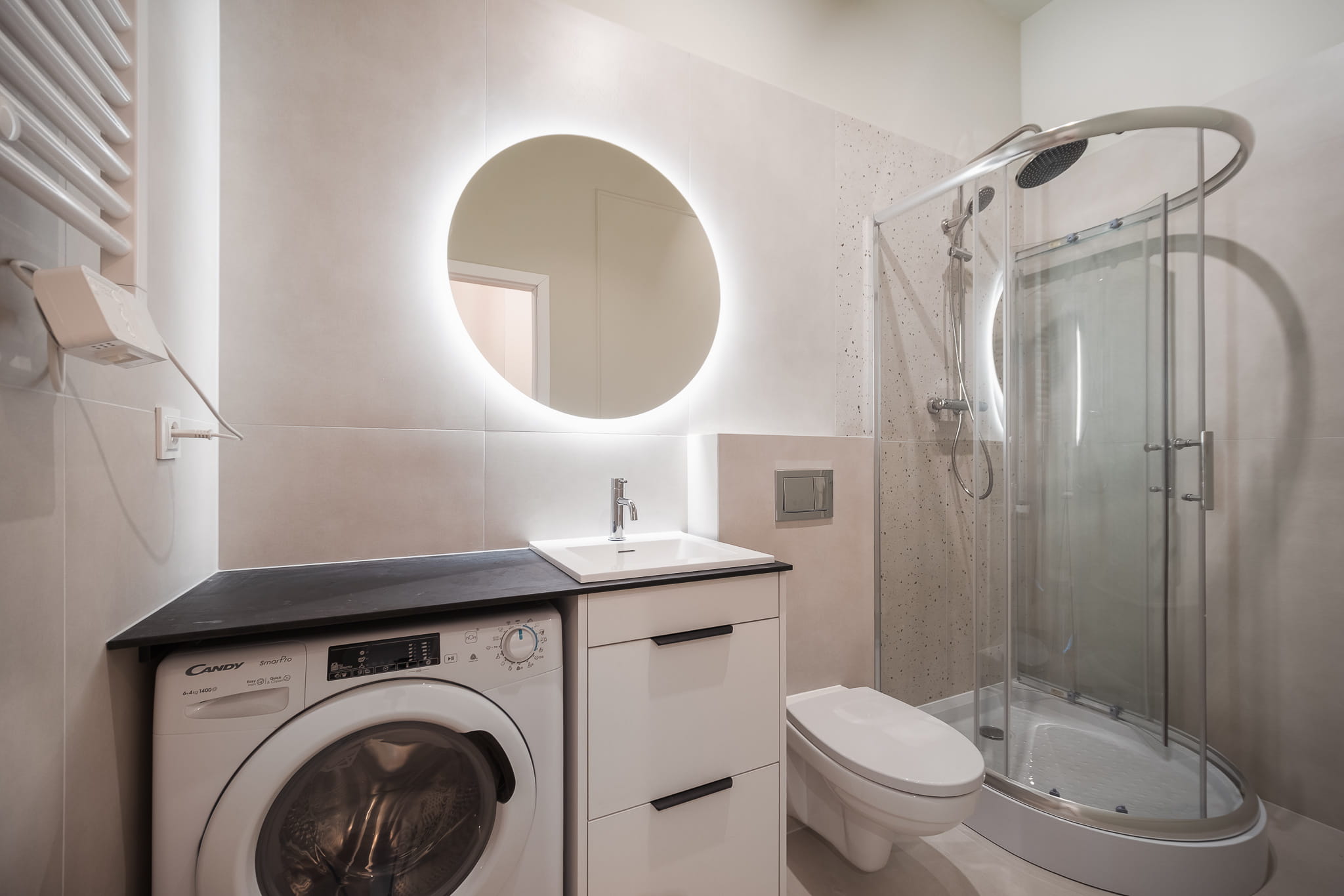 – A bathroom with a shower, toilet, and washing machine