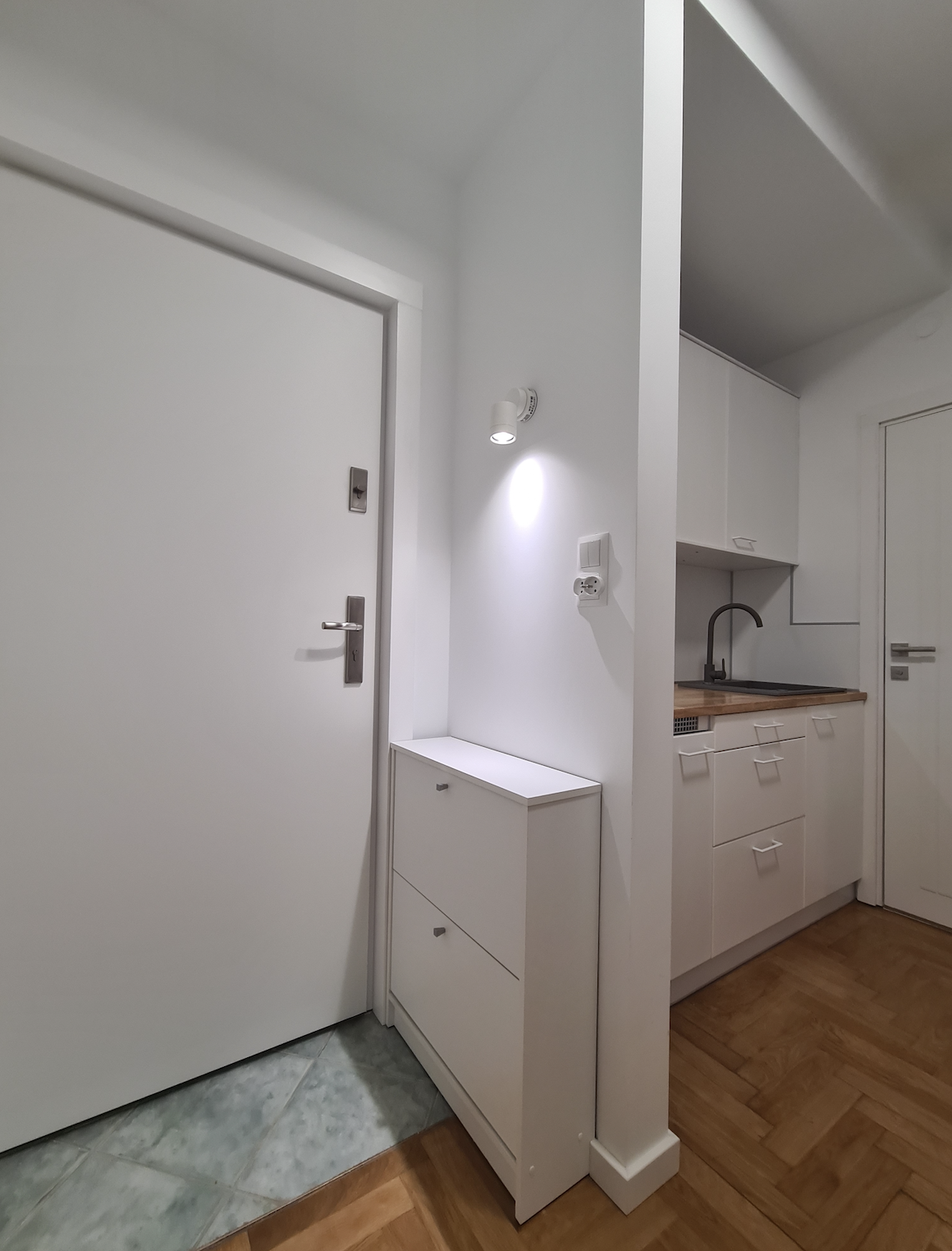 · an integrated hallway with a shoe cabinet, and a large two-level wardrobe with a mirror;