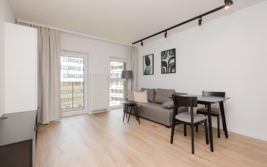 For Rent 2-Room Apartment, 42 m², Służew, Śniardwy 8. The apartment is move-in ready, with all necessary household appliances and furniture included. The floors are made of natural wood, and the walls